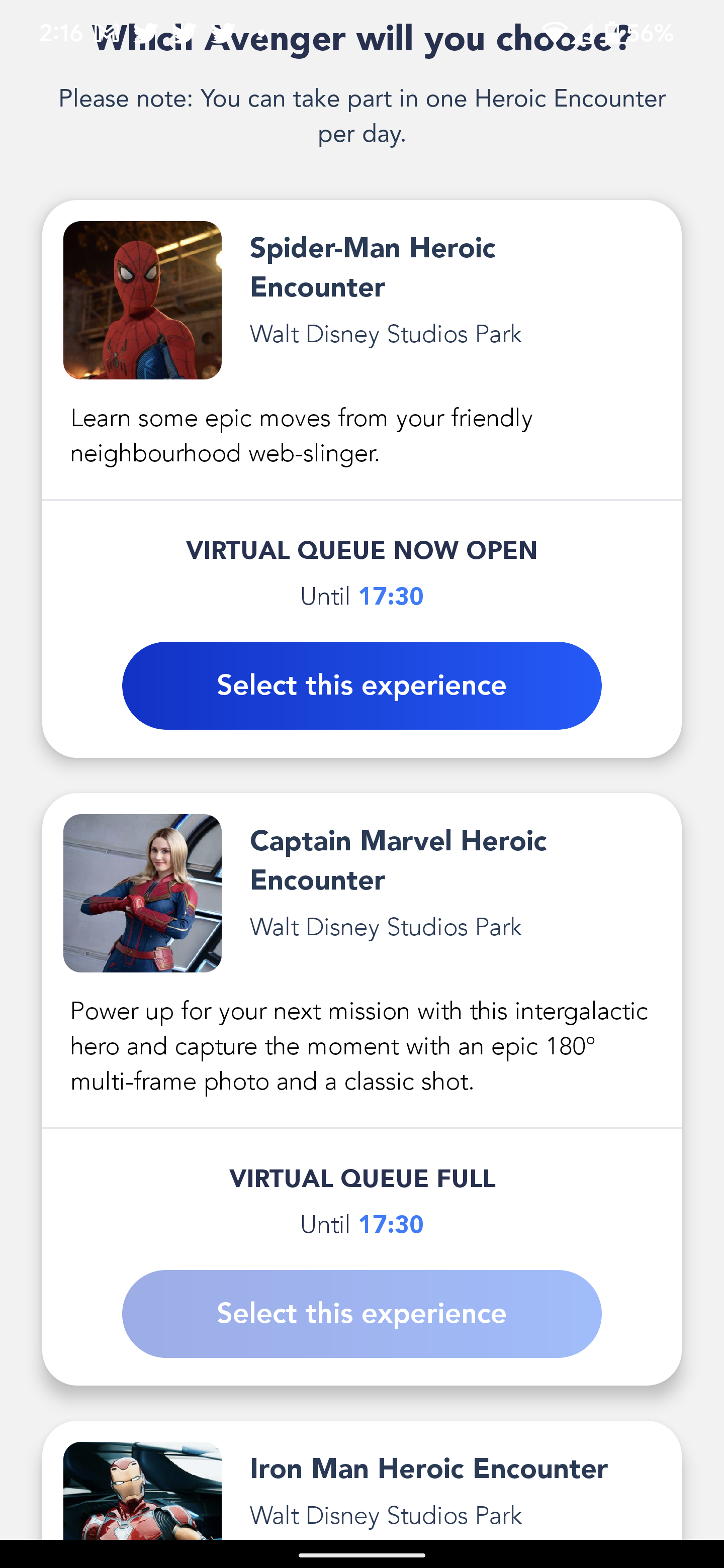 Auf dem nächsten Bildschirm siehst du, welche Superhelden sich mit Rekruten treffen und ob die virtuelle Warteschlange voll ist oder wann sie geöffnet wird. Wähle „Dieses Erlebnis auswählen“ für den Superhelden, den du treffen möchtest.