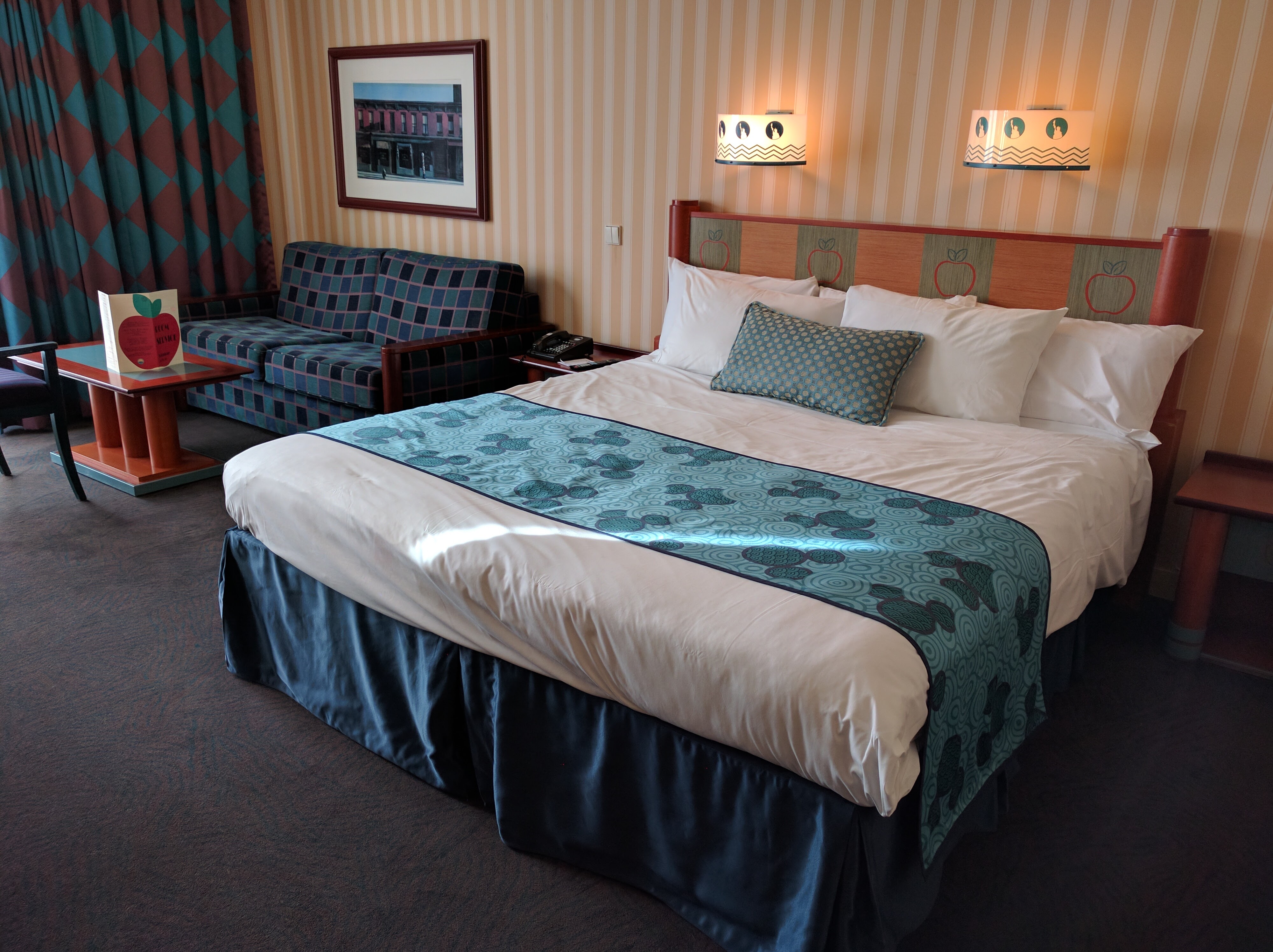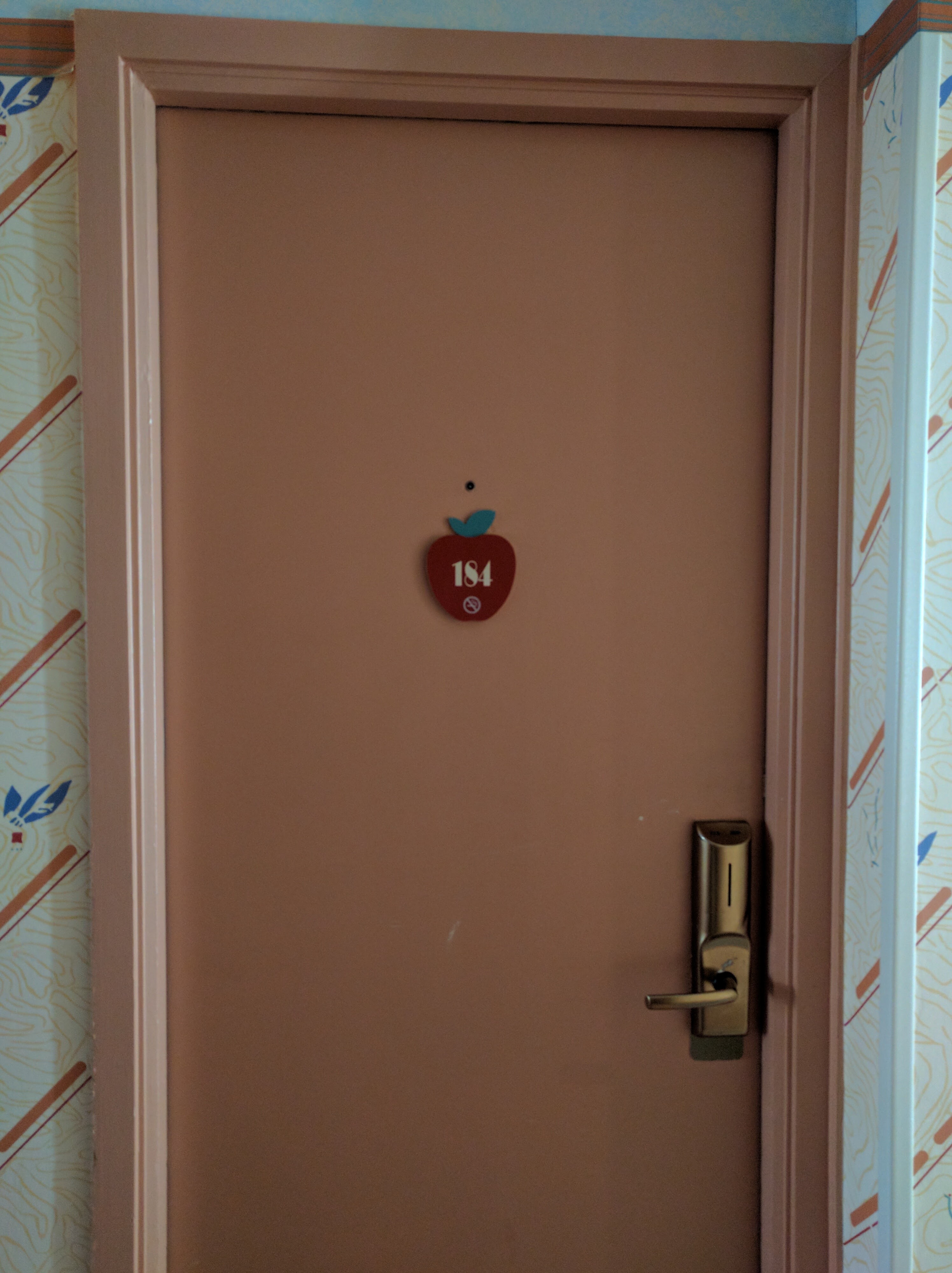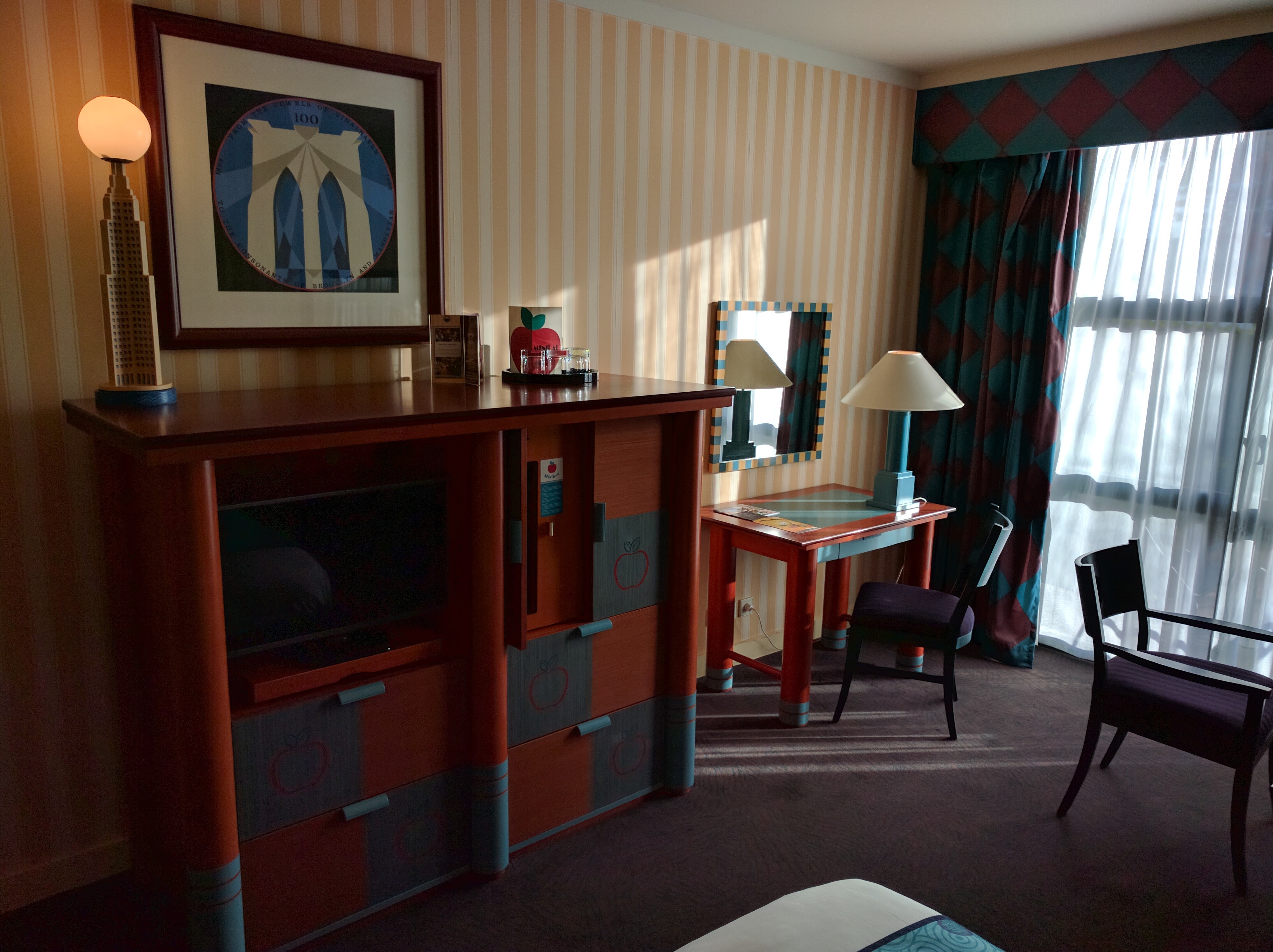 Die Thematisierung hier ist stark im New Yorker Geist mit dem Empire State Building Lampe, um die Äpfel im ganzen Raum. Es gibt viele gute Dinge über das Zimmer, die wir genossen haben. Es fühlte sich auf jeden Fall eine Klasse besser an als Newport und Sequoia, aber die Qualität ist mangelhaft. Das Zimmer war ziemlich staubig, viele Möbelstücke waren schmutzig oder extrem abgenutzt und die Tapete blätterte überall im Zimmer ab. Sogar die ausziehbare Couch hatte überall Flecken auf dem Kissen.