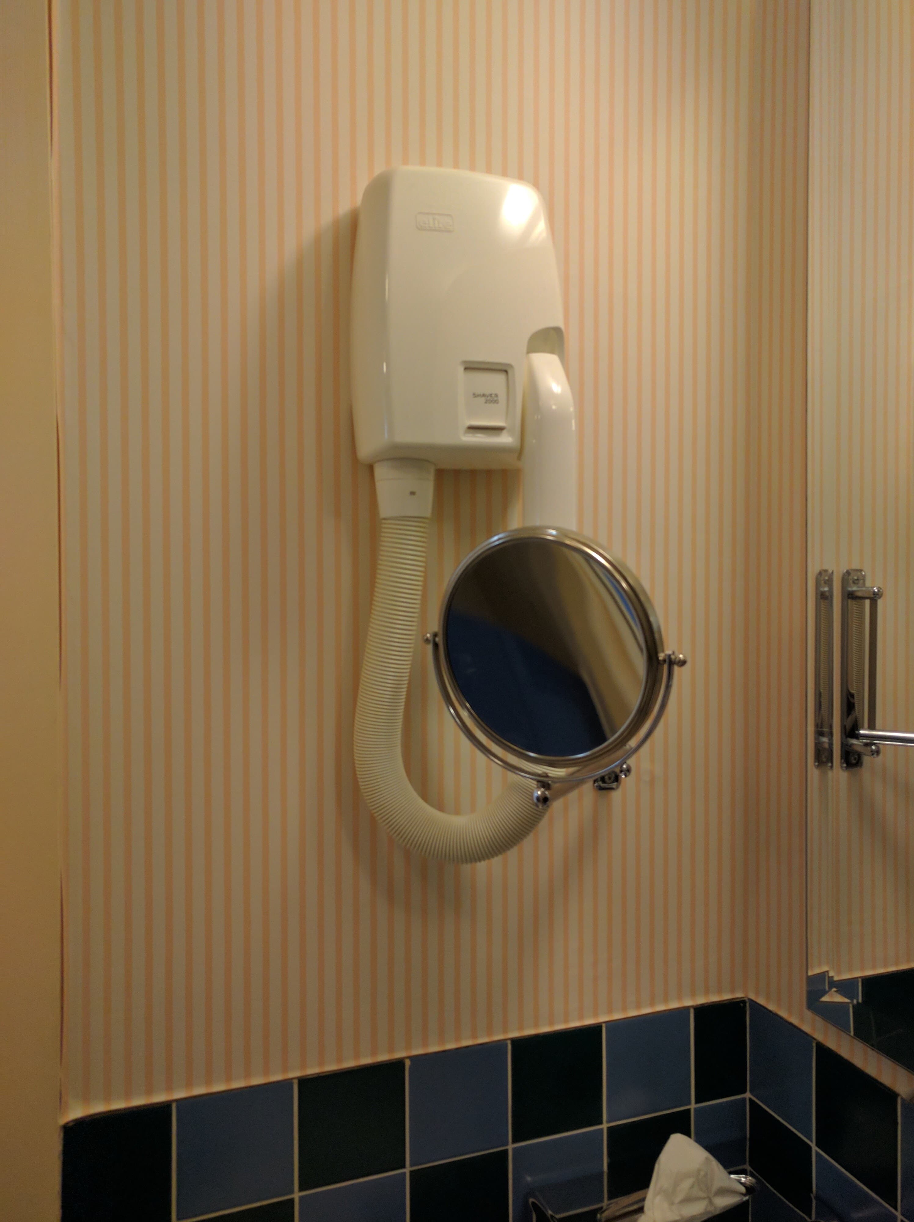 Das Badezimmer war sehr schön, hatte aber einige merkwürdige Merkmale, die wirklich zeigen, dass es mit europäischem Flair entworfen wurde. Die Toilette war eine merkwürdige Vorrichtung mit einem merkwürdigen Knopf für die Spülung der Toilette. Oh, und das elegante Badezimmertelefon neben der Toilette! Der Tresen und das Waschbecken waren schön, aber etwas kleiner und weniger praktisch als in den anderen Hotels. Aber wir können das Badezimmer nicht verlassen, ohne über den wirklich edlen Haartrockner an der Wand zu sprechen. Es gibt nichts Besseres als einen „Luftwärmer“ mit geringer Leistung.