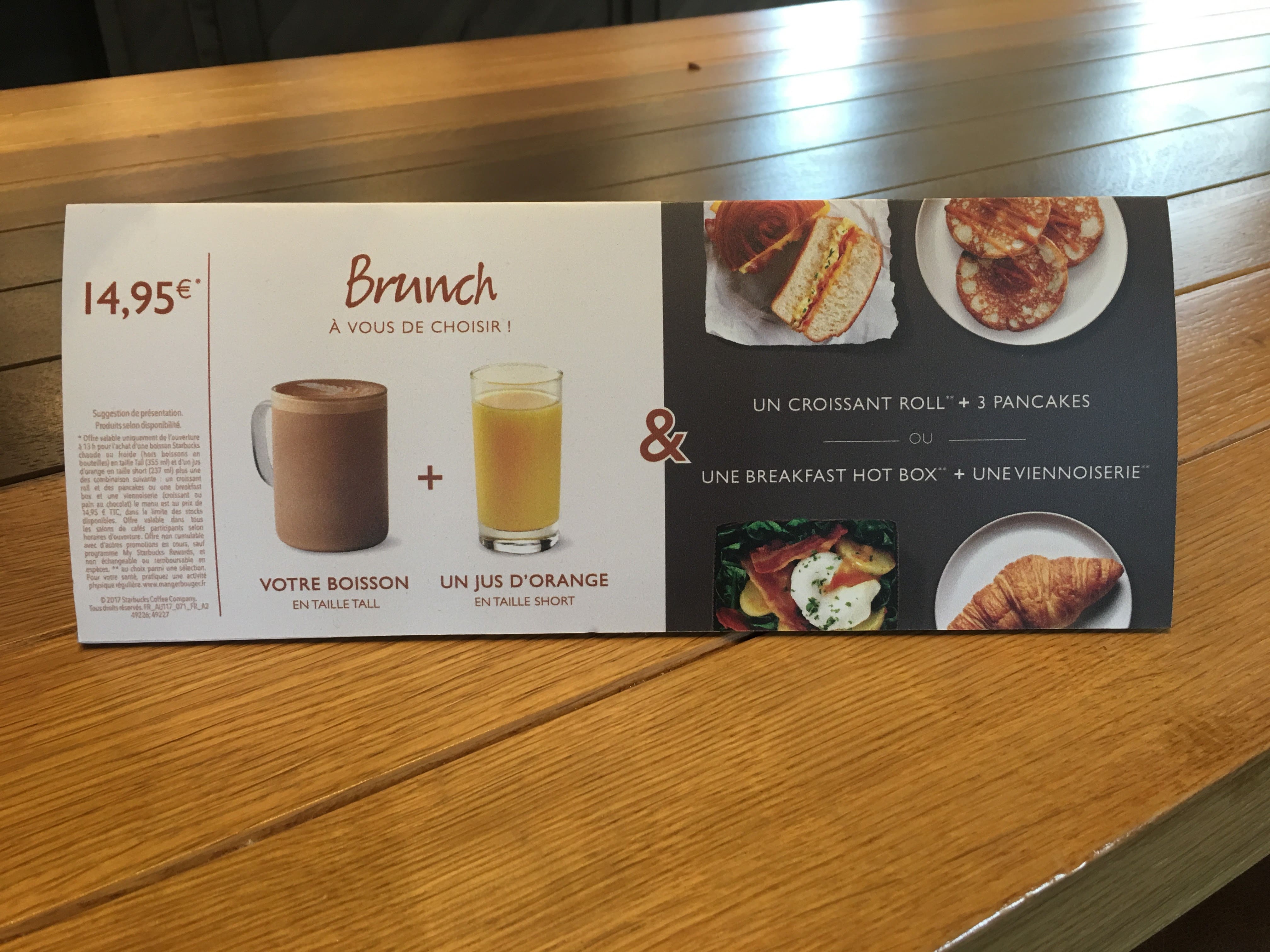 Dieses feste Menü kostet 14,95 Euro. Jahreskarten- oder Aktionärsrabatt gelten nicht. Sie können jedoch eine französische Starbucks-Karte verwenden. HINWEIS: ab November kostet das Menü tatsächlich 9,95 Euro.