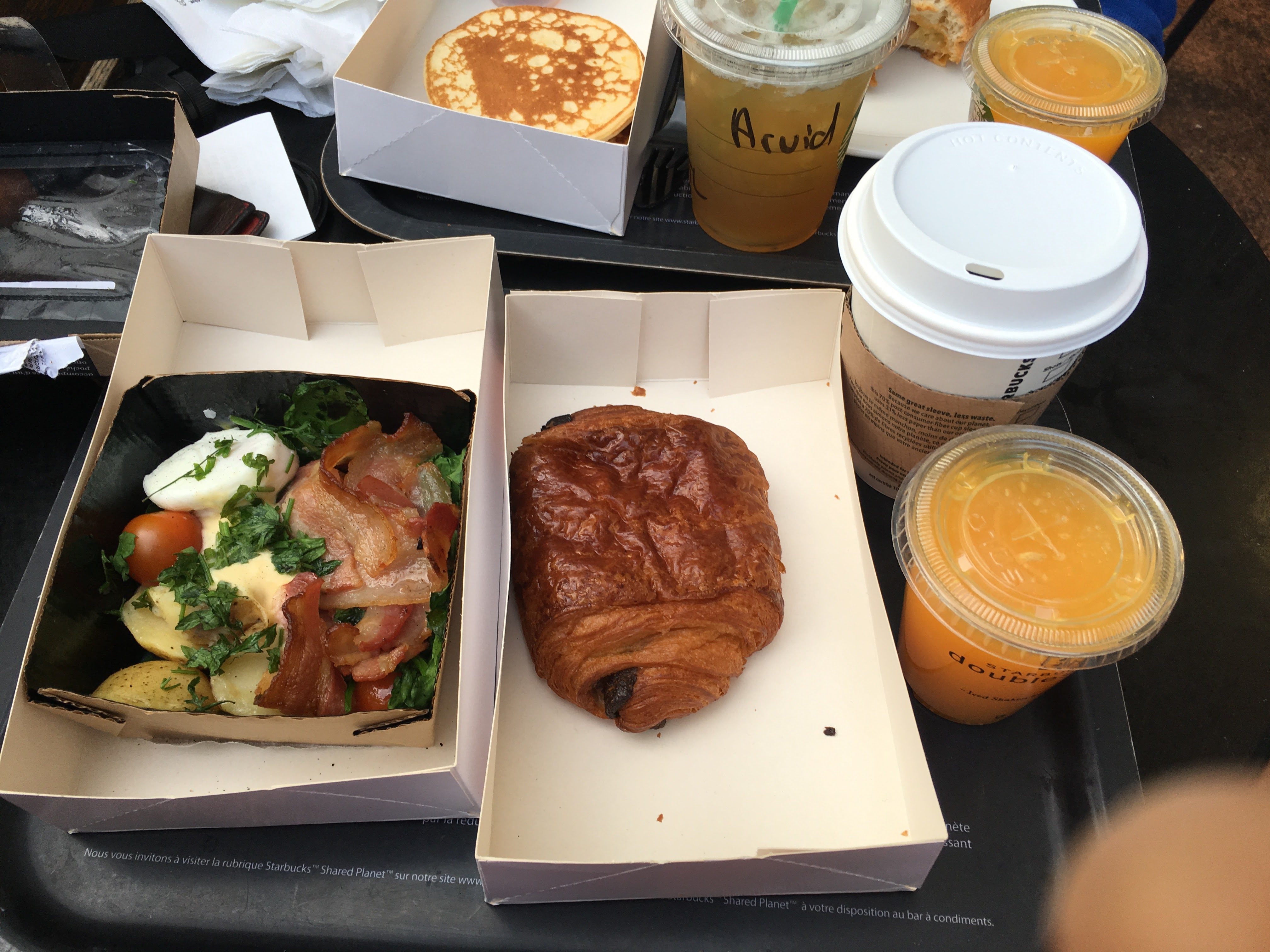 Neben der heißen Kiste hatte Christina die Möglichkeit, ein Croissant oder ein Pain au Chocolat zu wählen. Dazu gehört auch das große Getränk, also bestellte sie einen Tall Americano zu ihrem Pain au Chocolat und einem kleinen frisch gepressten Orangensaft.