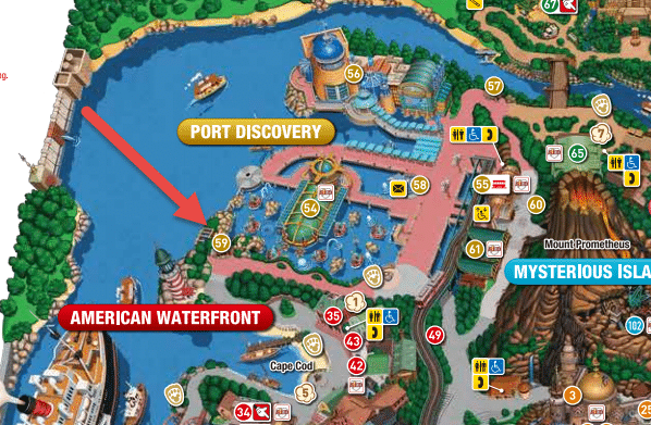 Als wir in Tokyo DisneySea waren, konnten wir das Ukiwa Bun (Shrimp) bei den Seaside Snacks bekommen. Sie finden diesen kleinen Stand auf der untenstehenden Karte, indem Sie die Nummer 59 suchen.