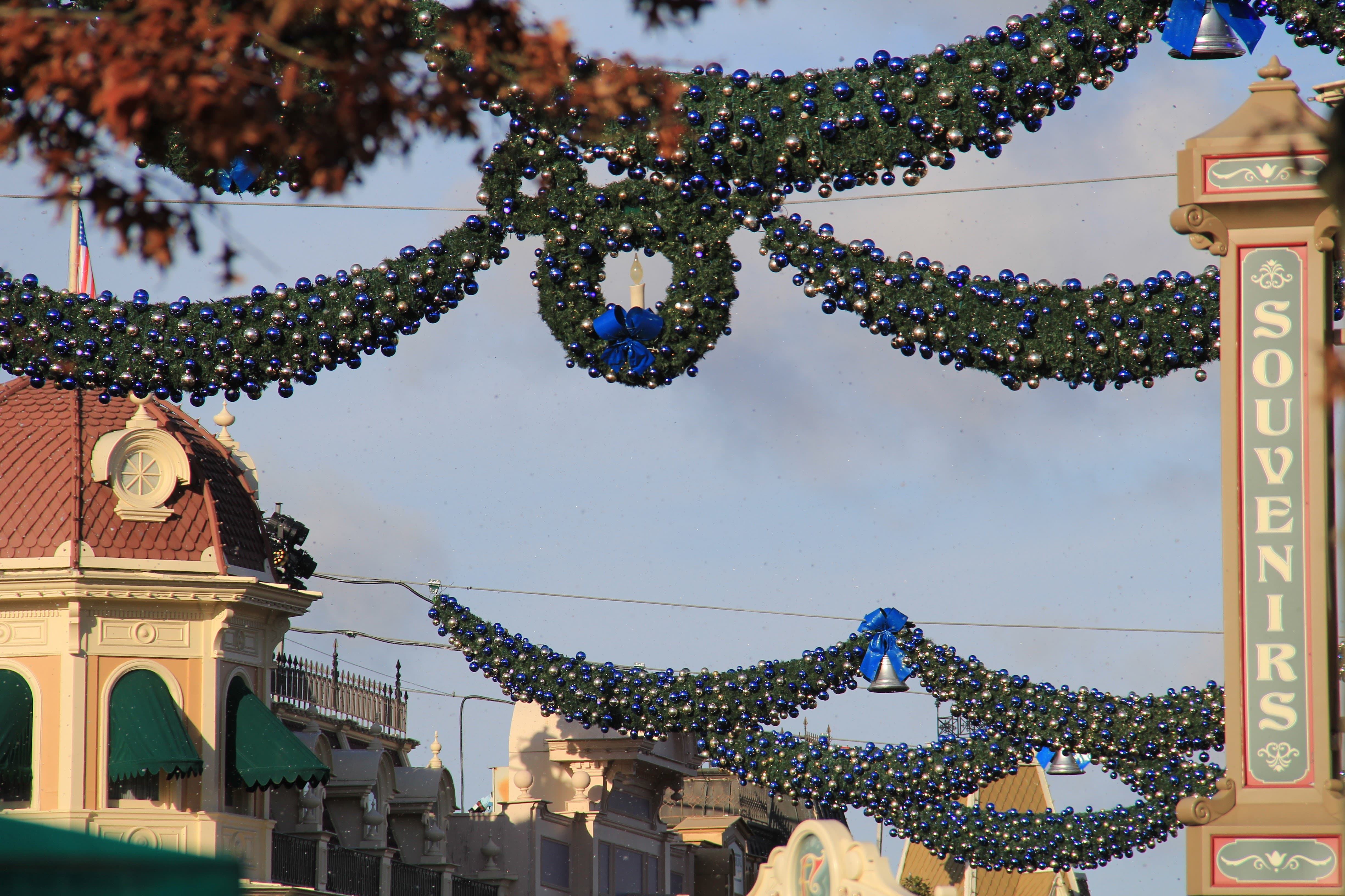 Beginnen wir damit, die Main Street U.S.A. zu betreten, wo Sie in verschiedenen Blau- und Weißtönen begrüßt werden. Die Bäume an der Drehscheibe sind blau gespritzt und die Grasflächen sind jetzt schneeweiß. Auch einige klassische Figuren sind als Schneemänner in der Gegend zu finden. Die klassischen Transportfahrzeuge sind mit Girlanden geschmückt, die das Thema mit blauen und goldenen Ornamenten und roten Schleifen verbinden. Im Mittelpunkt steht natürlich der 24 Meter hohe Weihnachtsbaum mit einer Sammlung von klassischem Schmuck und Spielzeug unter dem Baum.
