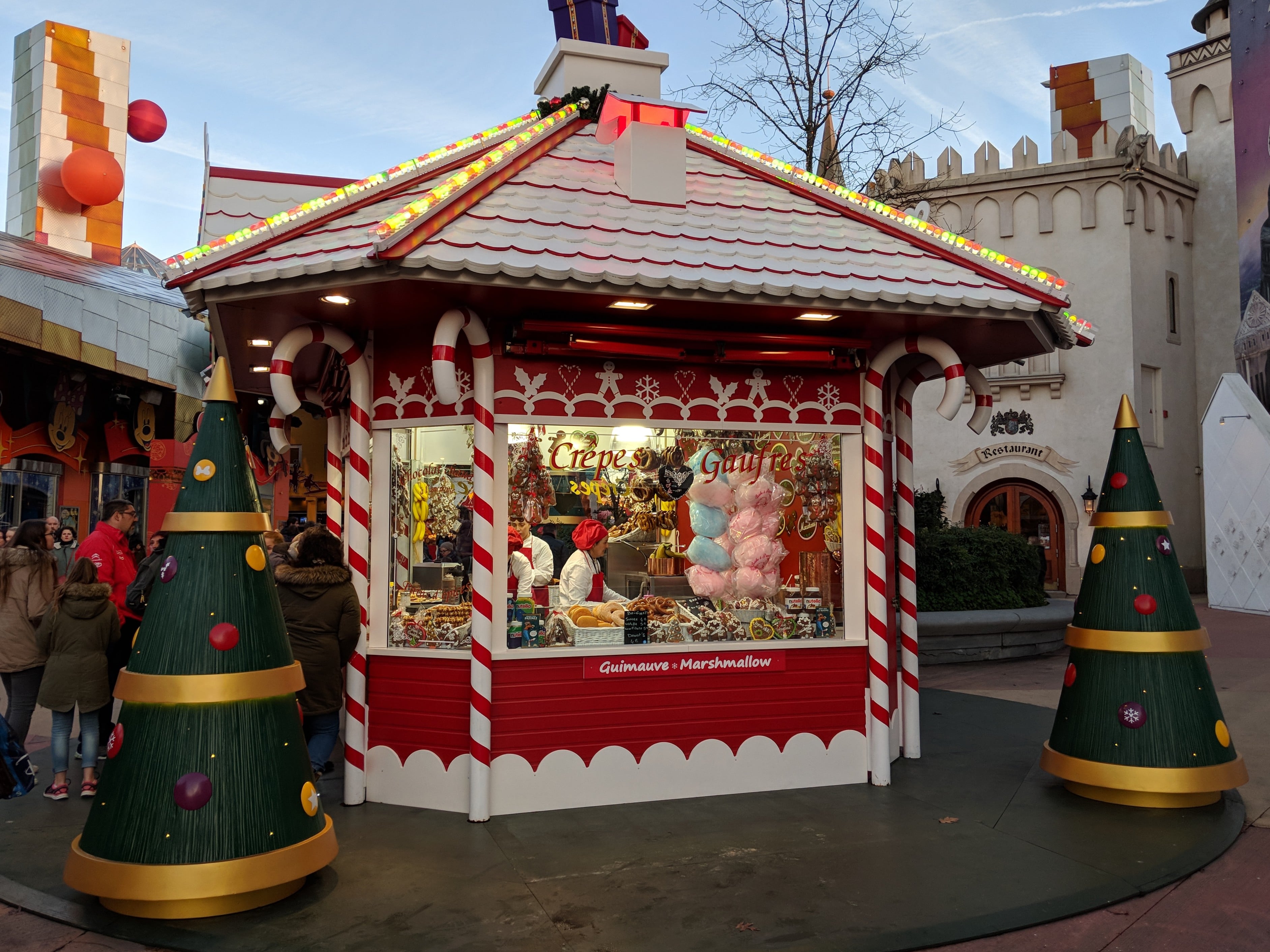 Auch außerhalb der Parks gibt es viel zu entdecken, denn in Disney Village findet ein Weihnachtsmarkt statt. Hier gibt es verschiedene Stände, die die traditionellen gerösteten Maronen, Raclette-Sandwiches, frisch zubereitete Süßigkeiten und Glühwein anbieten.