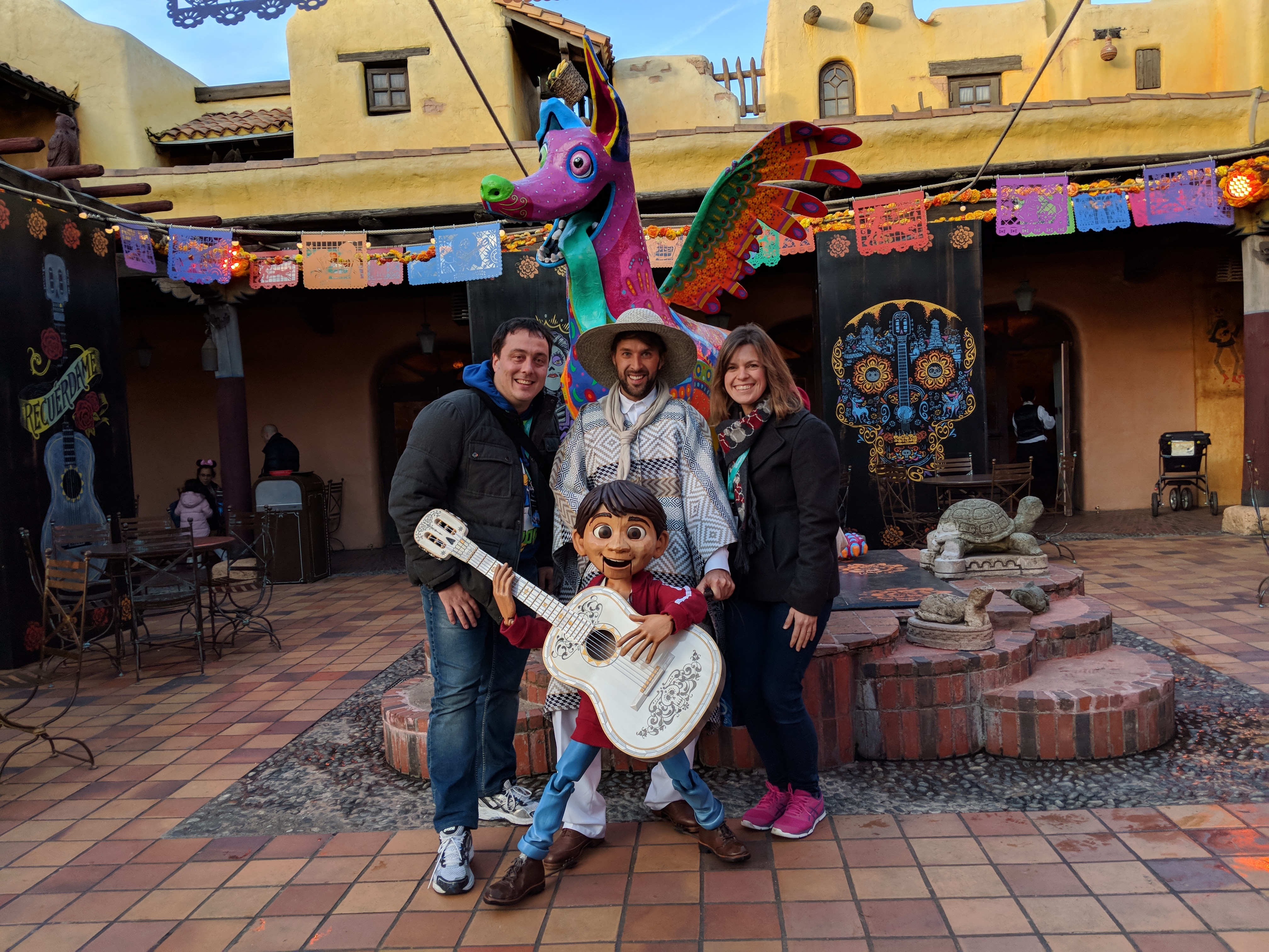 Fuente del Oro ist außen mit Bildern aus dem Film Coco dekoriert. Hier können Sie die Puppe von Miguel und einen seiner Freunde treffen. Oder lauschen Sie der traditionellen mexikanischen Musik, die von einer Mariachi-Band gespielt wird.
