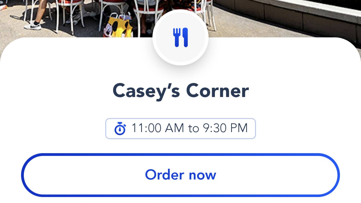 Today saw the launch of Mobile Food Order through the Disneyland Paris app. When you open the app, and navigate to the Food tab, you will be greeted with an option to book a table, and to “Pre-order Food and Drink”. In this section, two restaurants are currently listed: Casey’s Corner and Hyperion.