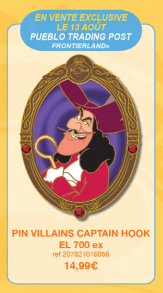 The first limited edition pin release for August is with Captain Hook. The pin is part of the Villain set. This limited edition (LE) only holds 700 pins and will be exclusively sold at the Pueblo Trading Post in Frontierland. And only on August 13th.