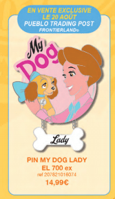 The second limited edition pin is Lady of Lady and the Tramp. It features Lady with Elizabeth “Darling” Brown. A small dog bone with Lady is attached to the bottom of the pin. The pin is limited to a quantity of 700 and will only be sold on August 20th at the Pueblo Trading Post.
