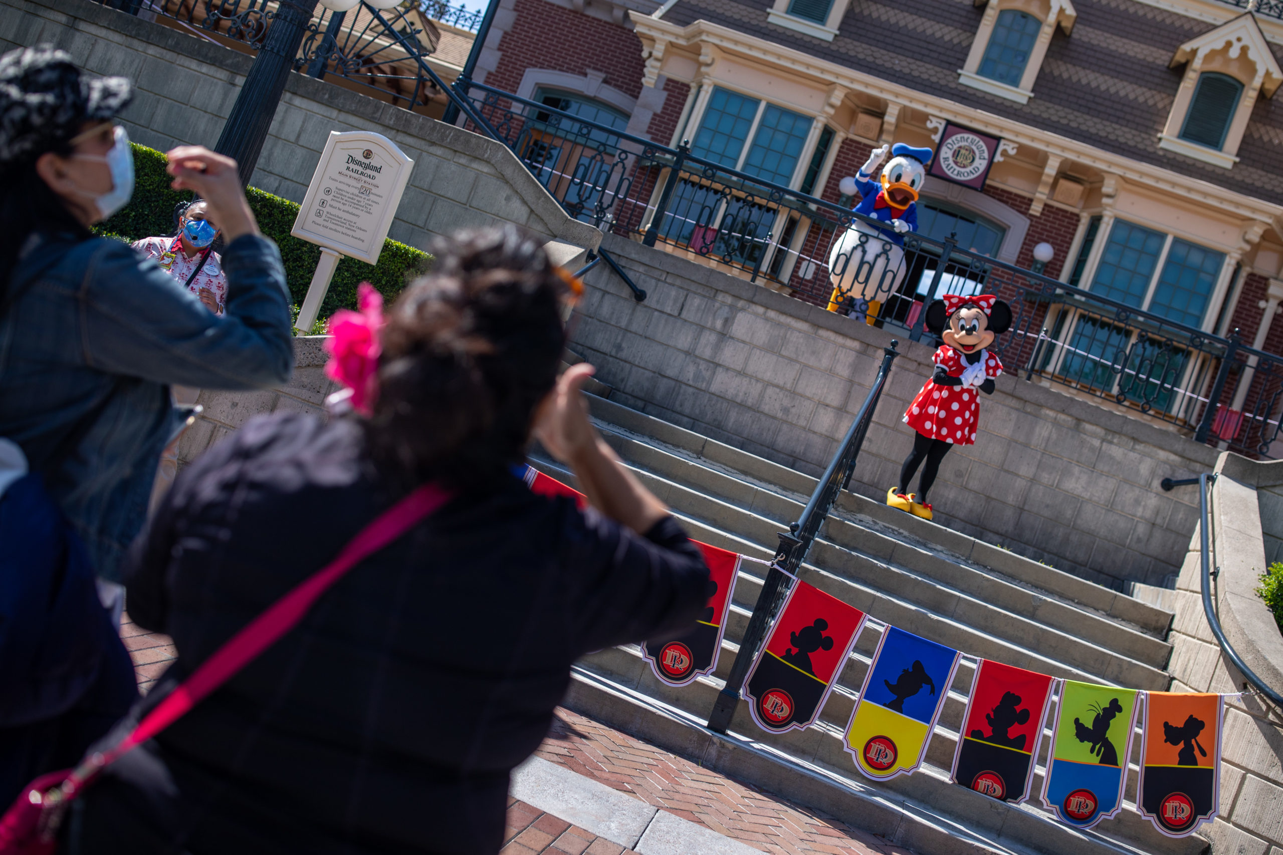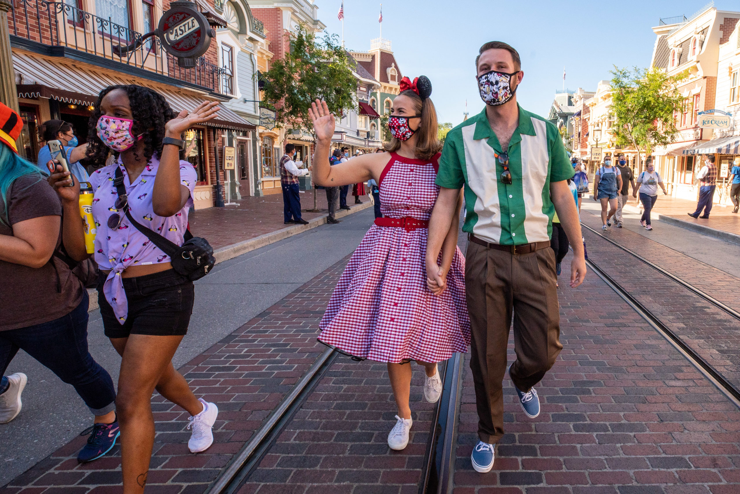 At Disneyland, guests may see Mickey Mouse and Minnie Mouse waving from the train station, or Disney Princesses such as Mulan appear at the Royal Theatre to wave and pose at a distance for guests taking selfies. At Disney California Adventure, Pixar pals may wave from the bandshell at Pixar Pier, and guests can share a laugh while taking photos with Mater and Lightning McQueen along Route 66 in Cars Land.