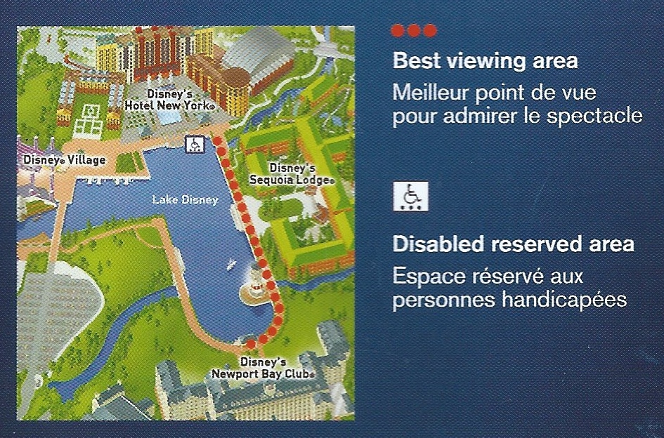 The firework display takes place on Lake Disney and the designated viewing location is the east side of the lake. The below map shows you the best viewing locations. It is advised to be on time, it starts at 20.30. Entry is free and therefore it could be busy.