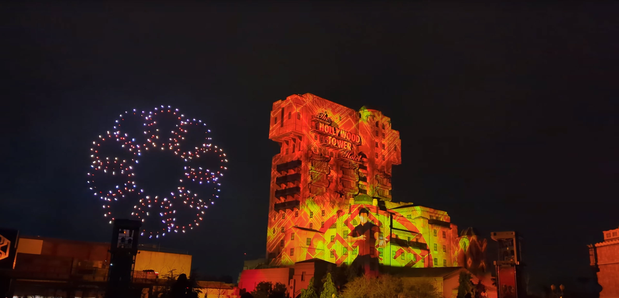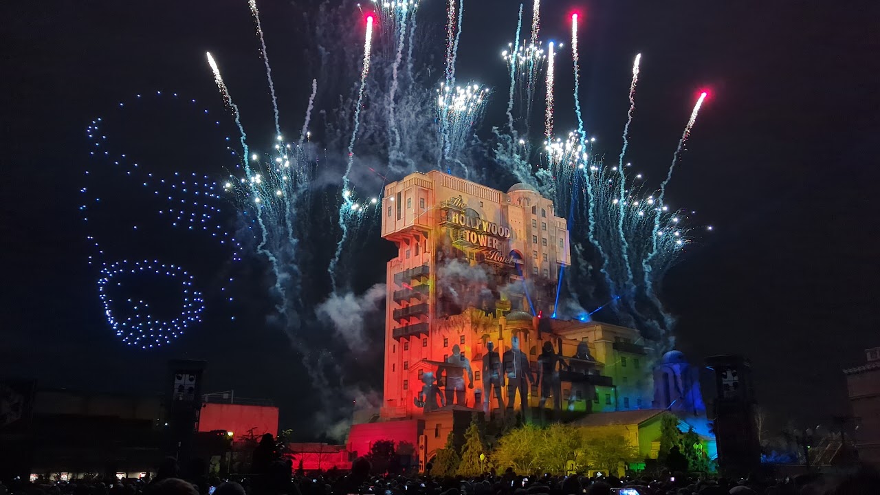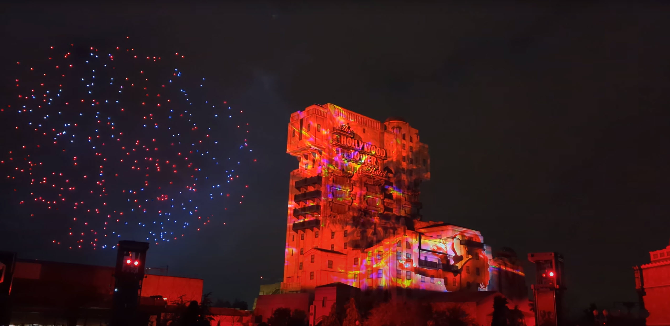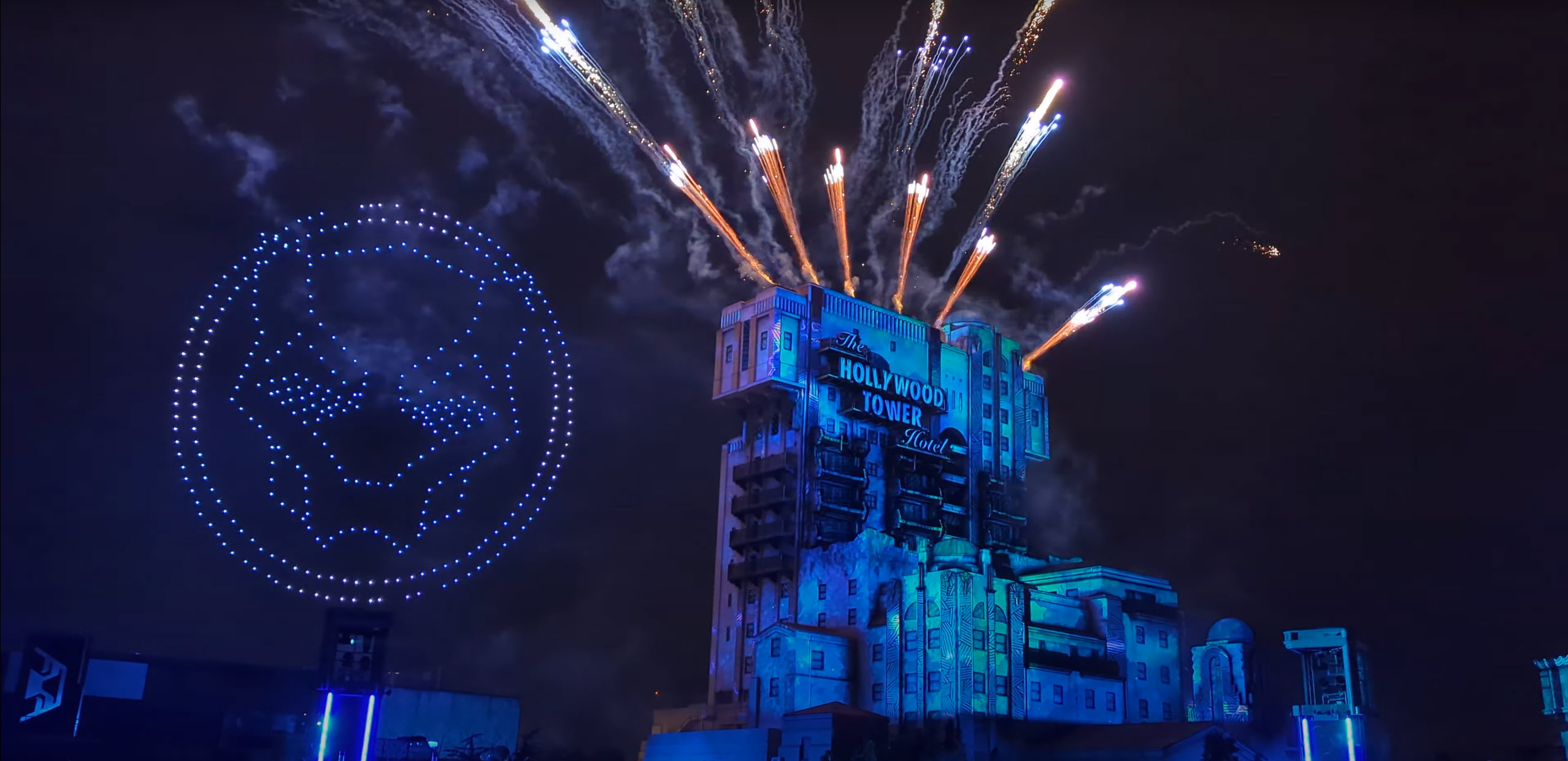 No drones for this scene, but fireworks shoot from the Tower of Terror
