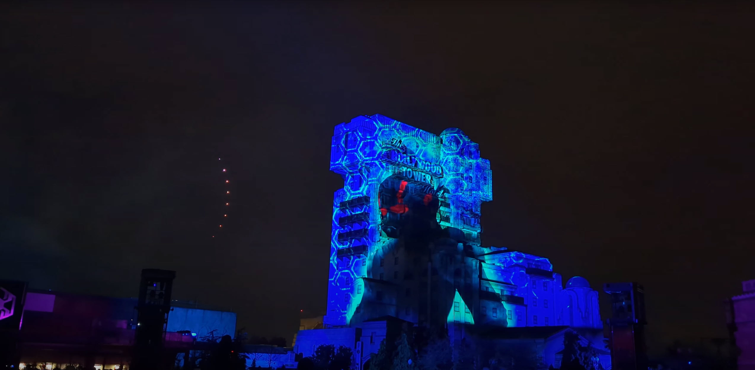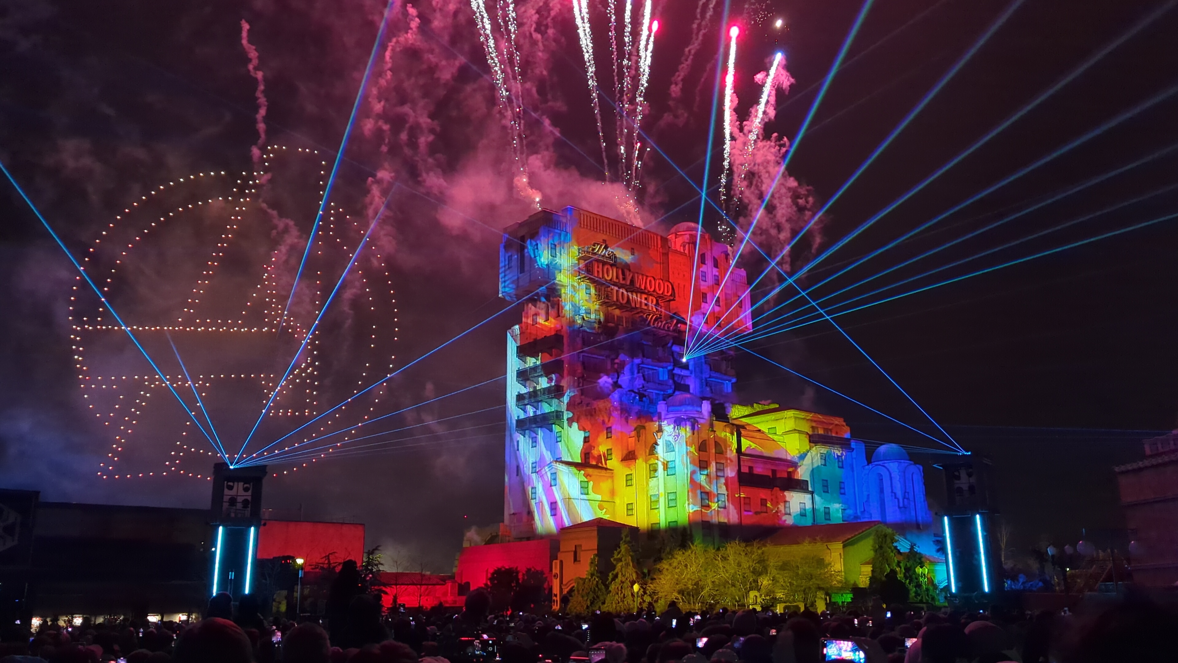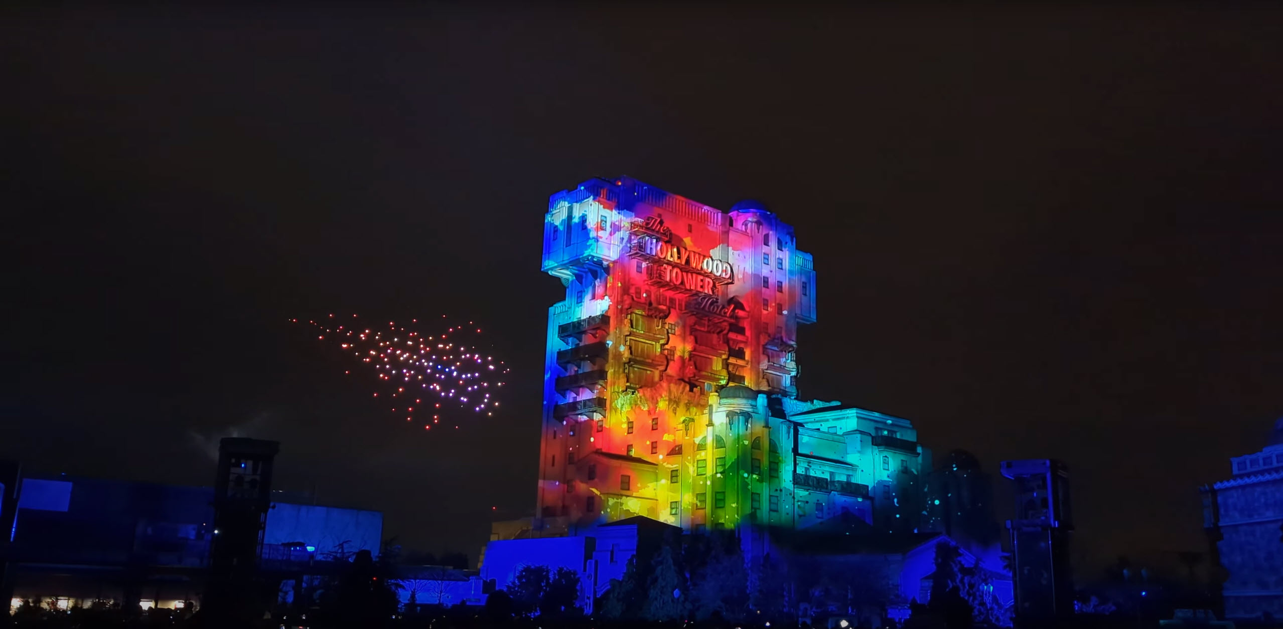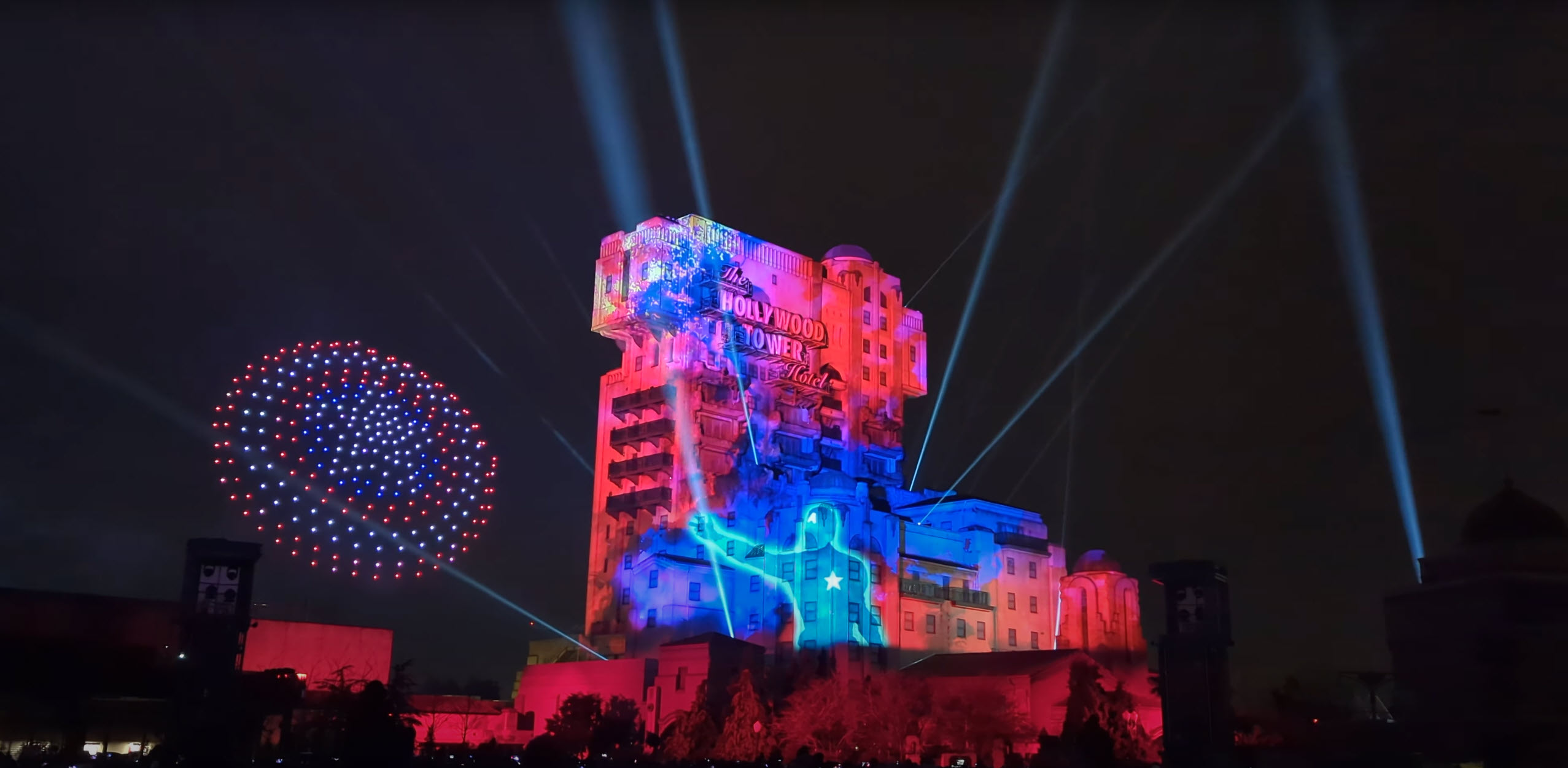No drones for this scene, but fireworks shoot from the Tower of Terror