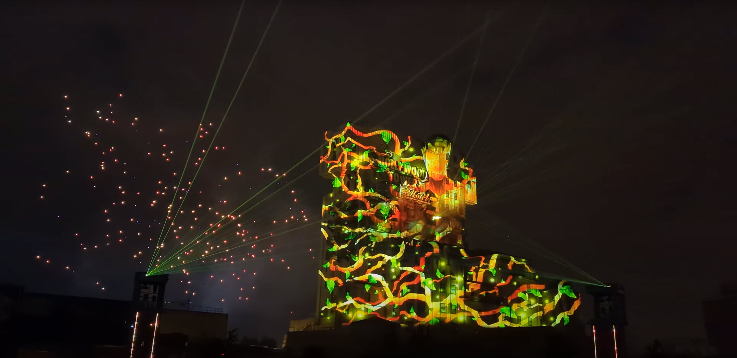 The drones form a portal and Dr Strange is projected on the Tower of Terror.