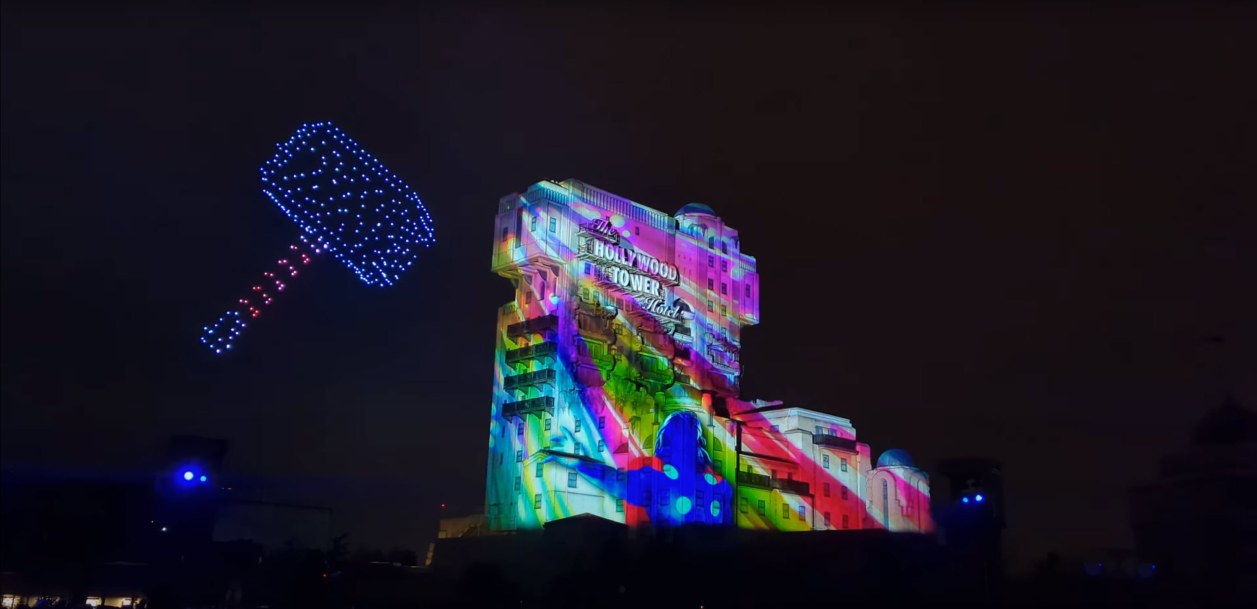 The drones show Captain Marvel flying from space to the Tower of Terror and back to space again.