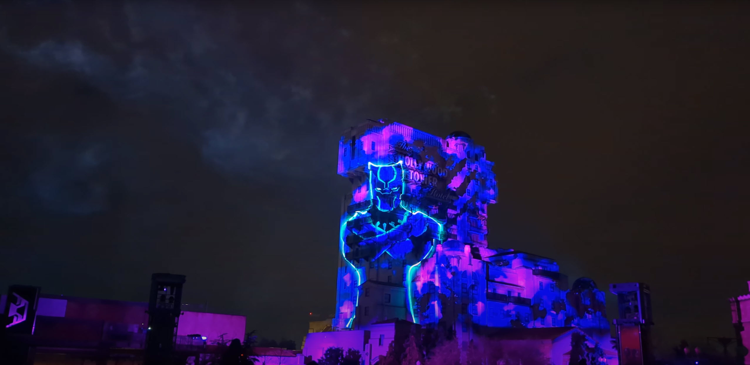 The drones form the Black Panther logo, and fireworks shoot off the Tower of Terror.