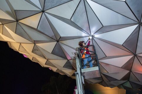 A few weeks ago we shared our exciting plans for new Spaceship Earth lighting debuting Oct. 1, 2021 as a Beacon of Magic during the 50th anniversary celebration Walt Disney World. Today I’m excited to give you a first look at one of the points of light, as overnight our team test fit the very first of these fixtures before we start installing at the top and working our way down! Our team at Imagineering has been hard at work innovating the design and technology for this poetic and inspirational lighting concept. And we’ve had to get quite ingenious in how we go about installing these new fixtures and all the high-tech systems so that they seamlessly integrate with the iconic profile of Spaceship Earth. There is a lot more work ahead as we continue installation and ready for testing, but I couldn’t wait to share with you that we’ve begun.