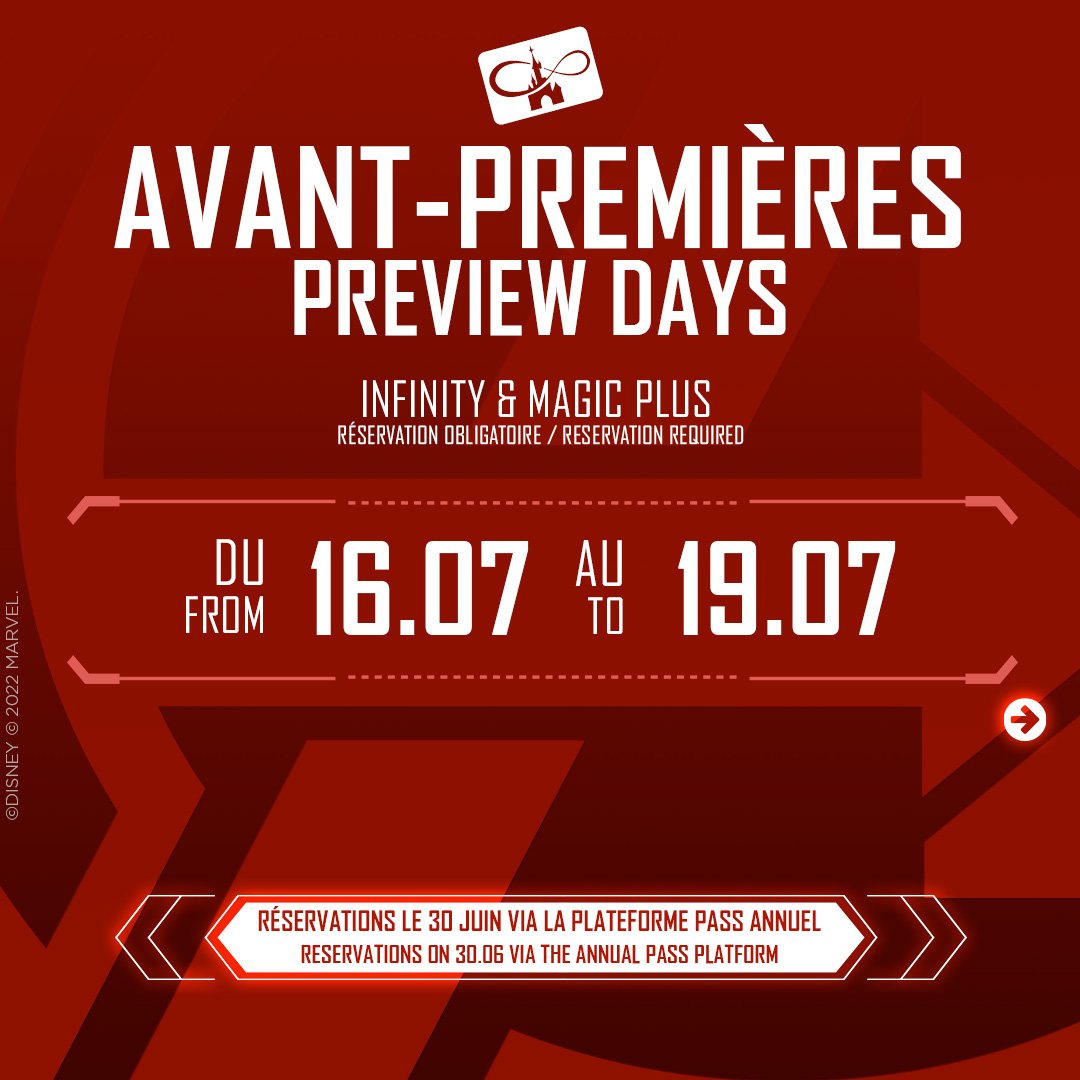 Comme annoncé il y a deux semaines, les journées d’avant-première du Avengers Campus ont été annoncées. Ces journées ne seront accessibles qu’ aux détenteurs de cartes annuelles Infinity et Magic Plus. Les dates sont les suivantes :