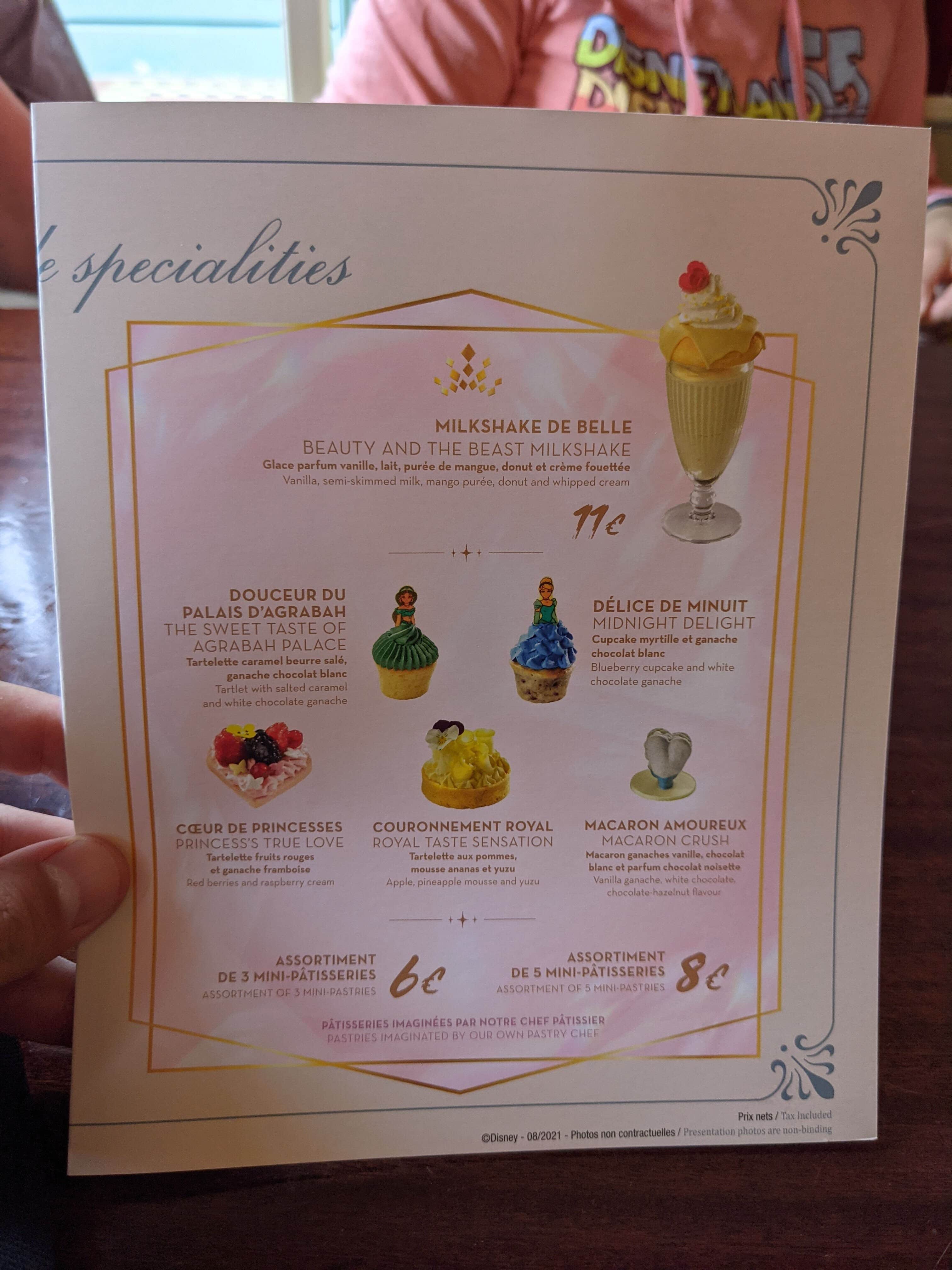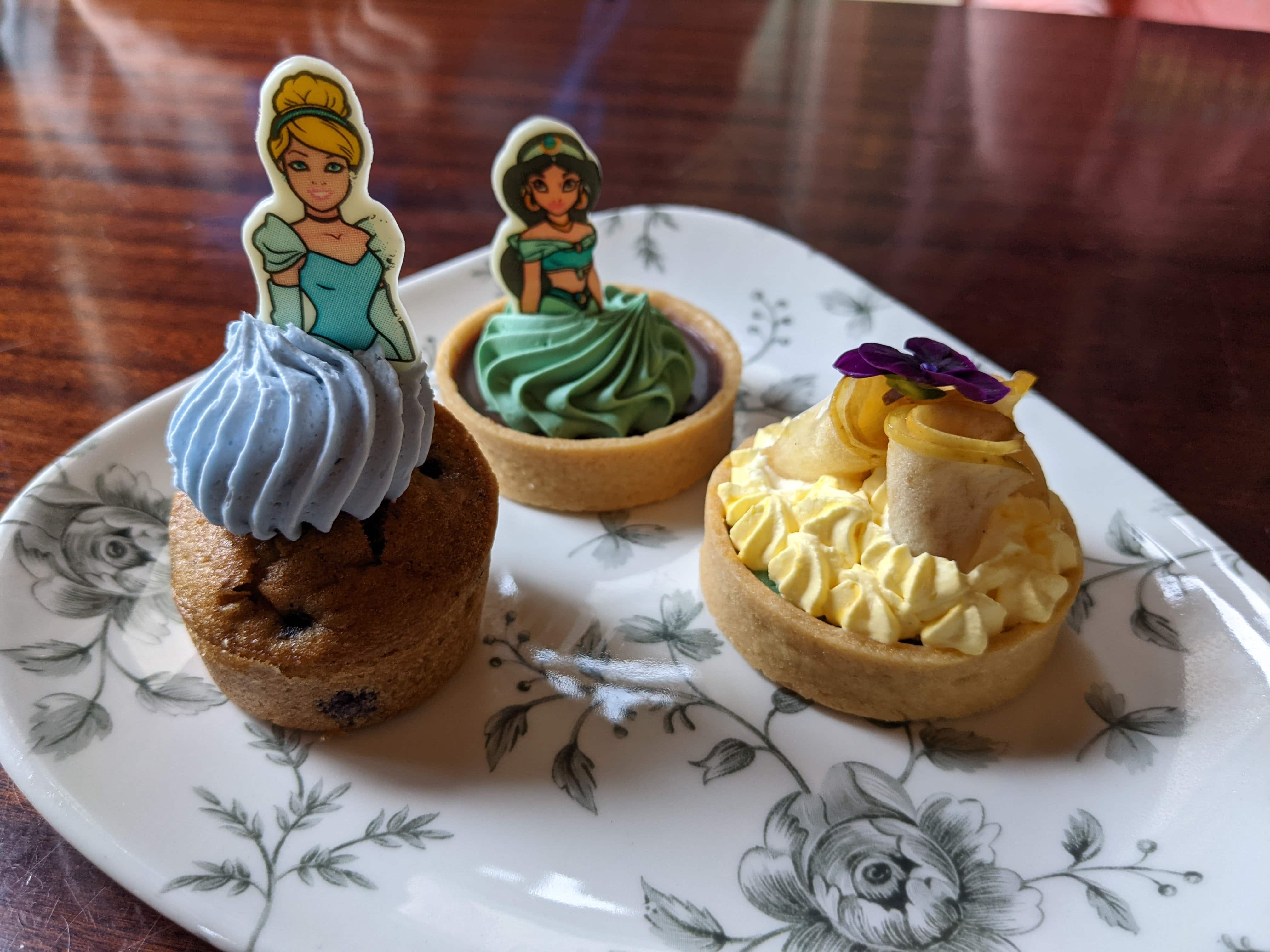 Lors de notre visite à Disneyland Paris pendant l’Ultimate Princess Celebration, nous avons eu l’occasion d’essayer le Royal Tea Time Treat au Victoria’s Home-Style Restaurant le premier jour de l’événement. Les clients ont la possibilité de goûter plusieurs pâtisseries, un milkshake et une glace spéciale. Nous avions particulièrement envie de pâtisseries et d’un milkshake ; nous avons opté pour le Victoria’s Home-Style Restaurant, mais vous pouvez également obtenir ces pâtisseries au Plaza Gardens Restaurant.