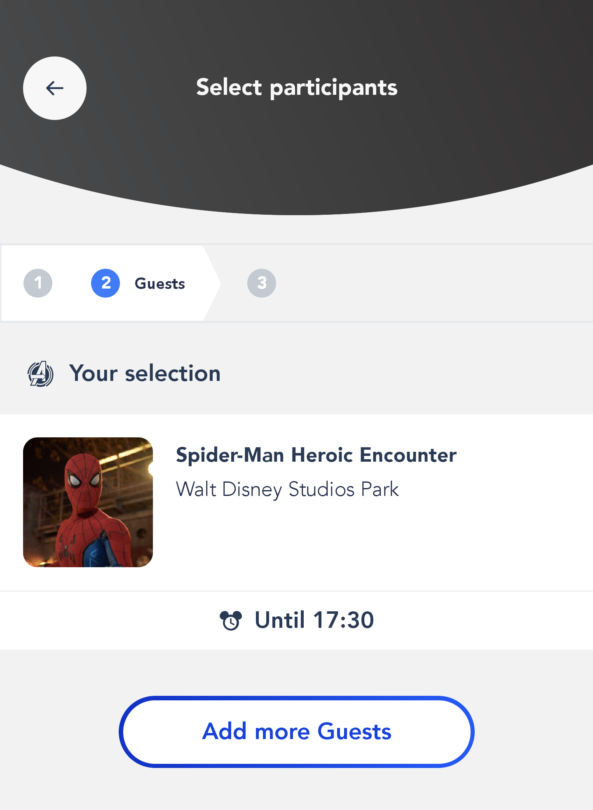 On the next screen, you will add the eligible guests. After you confirm all details, you will be presented with the wait time, which will update automatically. Once your turn, you will receive a notification and head to the Hero Training Center.