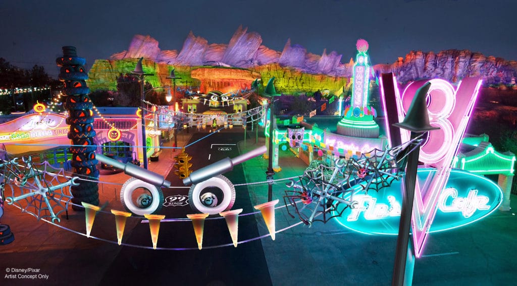 Scary the Scarecar will stand guard over the entrance to Route 66, a preview to the Haul-O-Ween transformation awaiting guests in Cars Land. With Fillmore’s Jack-Oil Lanterns, the web spun over Flo’s by a Spider-Car, and the Cozy Cone dressed up in car-stumes, the townsfolk turn Radiator Springs into Radiator Screams.