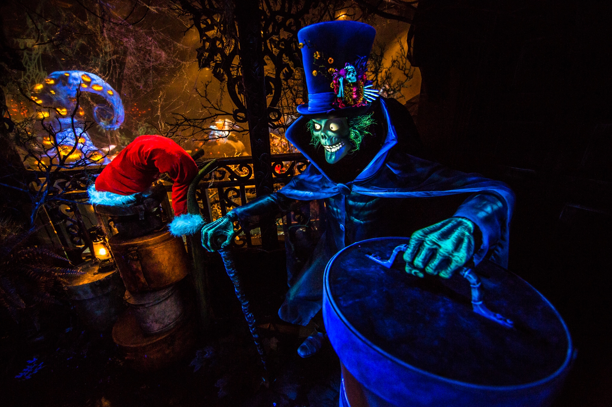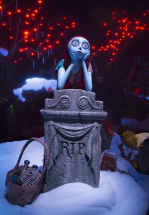 Haunted Mansion Holiday celebrates the collision between Halloween and Christmas as Jack Skellington, from the Walt Disney Pictures classic “Tim Burton’s The Nightmare Before Christmas,” offers his unique take on the holidays. The annual Haunted Mansion Holiday gingerbread house, presents a new design each year, and this year it’s the creepy Oogie Boogie in the form of a 7-foot-tall cookie on the table in the Mansion ballroom. He is peeling back the roof of a gingerbread Haunted Mansion, uncovering myriad gummy bugs and worms.