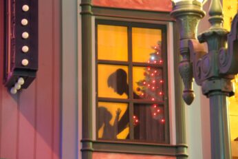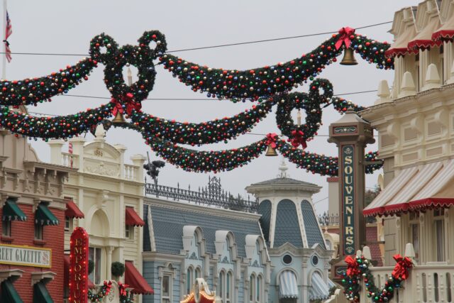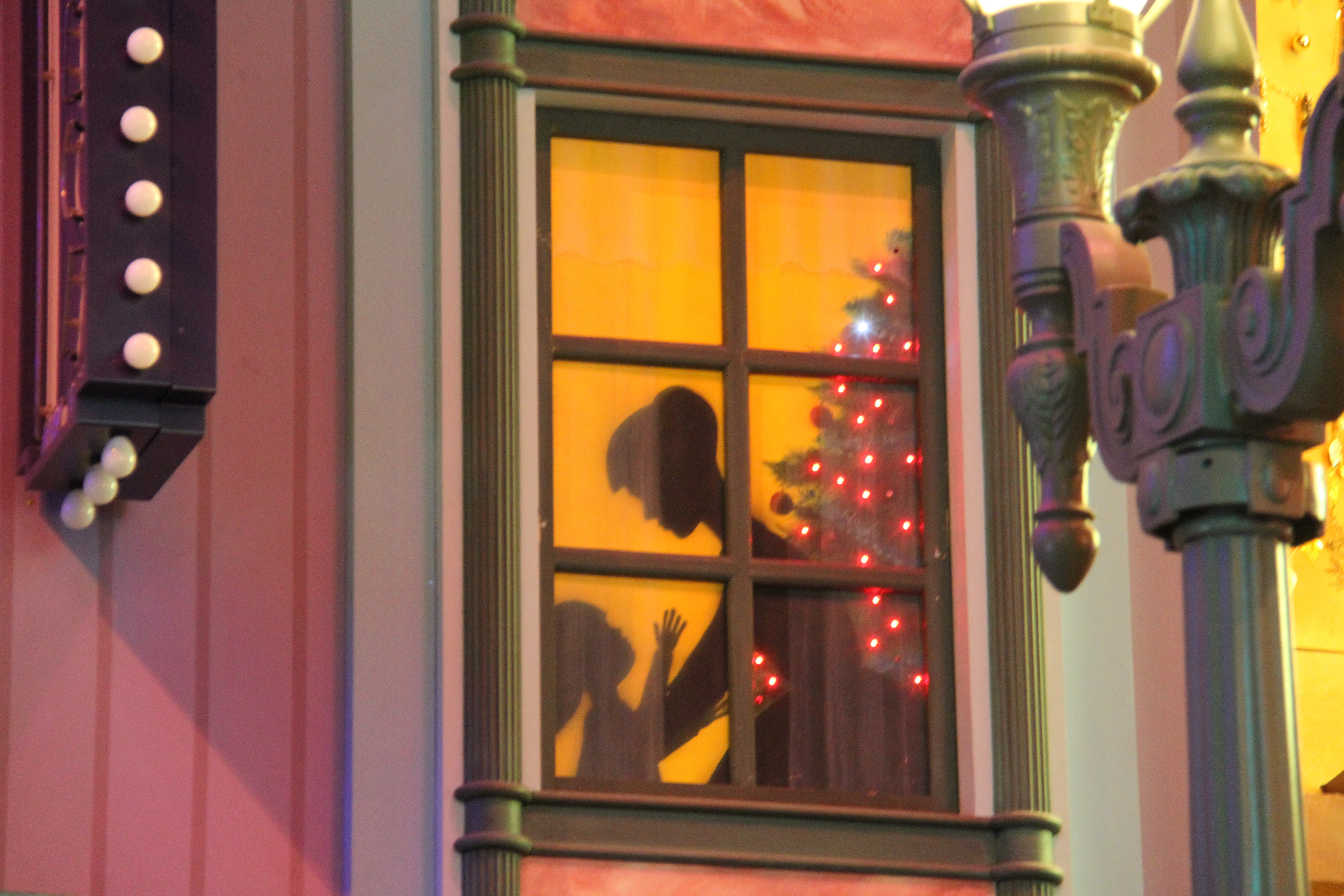 Along Main Street USA you would see that the buildings were decorated with wreaths, lights and more. Several windows were decorated with Disney characters in their Holidays outfit and a wintry landscape.