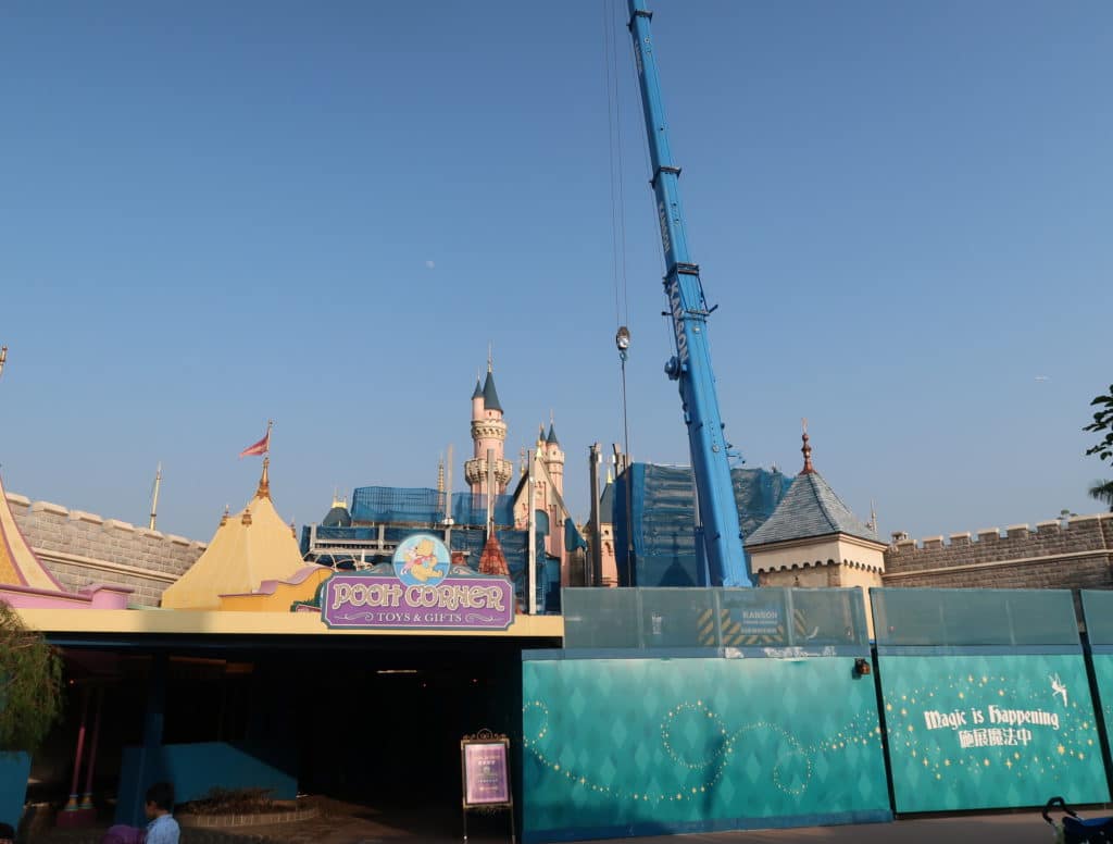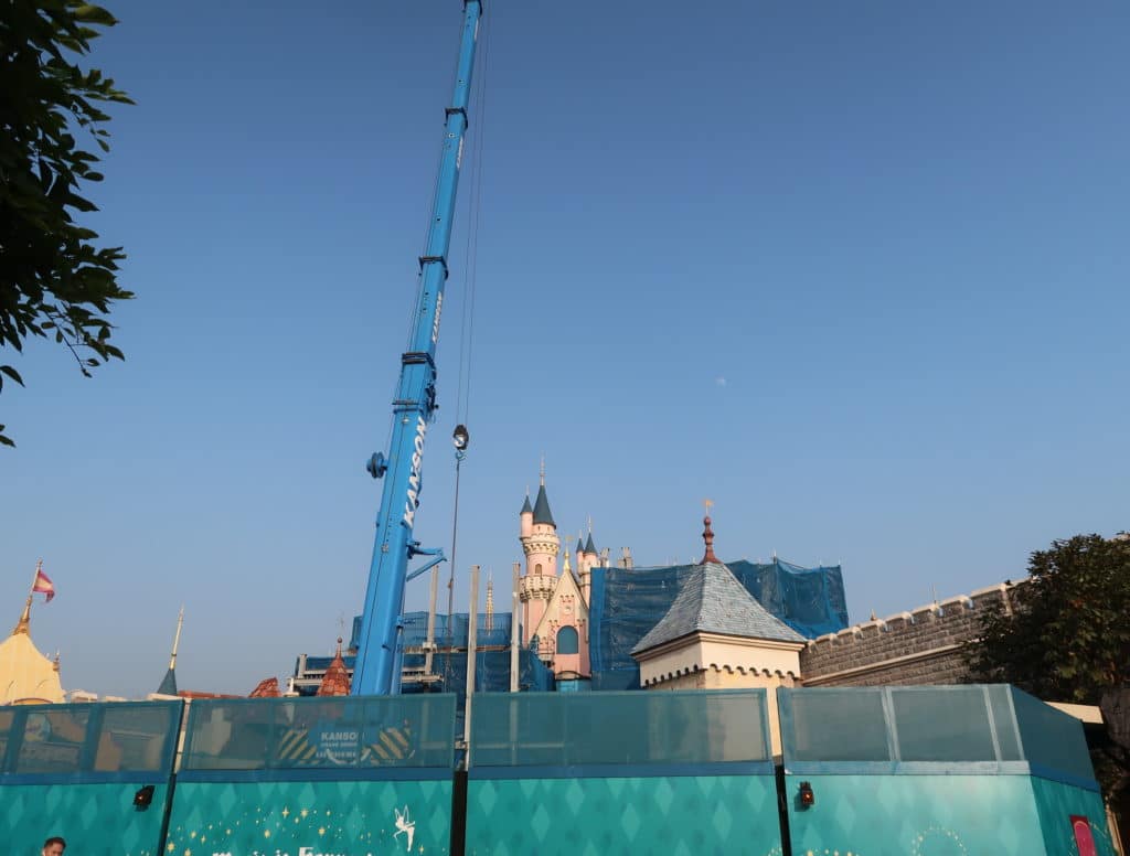 About a year into the castle transformation at Hong Kong Disneyland and we are seeing more and more construction happening. When we were there in November 2018 you could hear construction happening, but in pictures taken by our friend Mickey Kitto on Friday January 18 2019 you can see cranes and scaffolding rising up next to the castle.