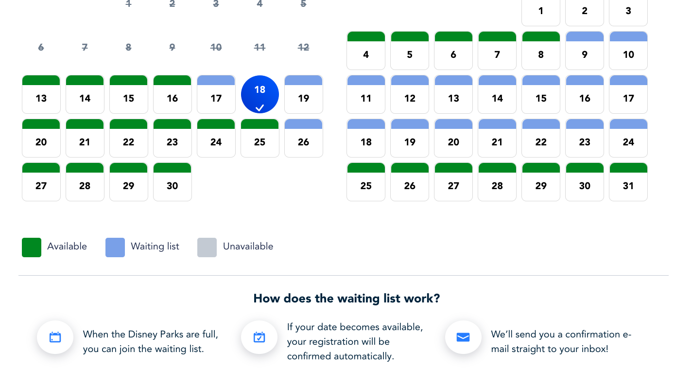 Disneyland Paris ha aggiunto una funzione di lista d’attesa al suo sistema di prenotazione dei parchi. Quando gli ospiti cercano di effettuare una prenotazione per un giorno che è già al completo, viene offerta la possibilità di iscriversi a una lista d’attesa. È possibile inserire la lista d’attesa solo per i giorni in cui il parco è al completo. Per un pass annuale, è possibile tenere in totale solo tre prenotazioni e iscrizioni alla lista d’attesa combinate. Ciò significa che non è possibile iscriversi alla lista d’attesa quando si hanno già tre prenotazioni e viceversa.