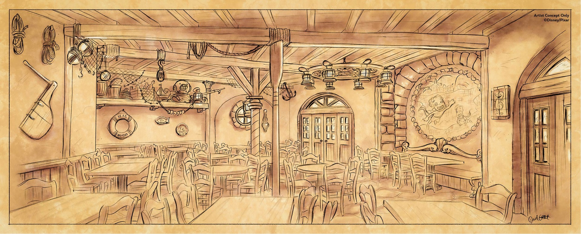 Quando si è presentata l’opportunità di ampliare il ristorante, Imagineers hanno pensato naturalmente al mostro marino preferito dai fan, da aggiungere alla varietà di personaggi rappresentati nel parco. Questa nuova area tematica porterà un’atmosfera marinara con molti dettagli e oggetti che evocano la cultura della pesca e la cucina locale che si può trovare nella città natale di Luca, Portorosso, oltre a fornire ulteriore spazio agli ospiti per gustare le specialità italiane.