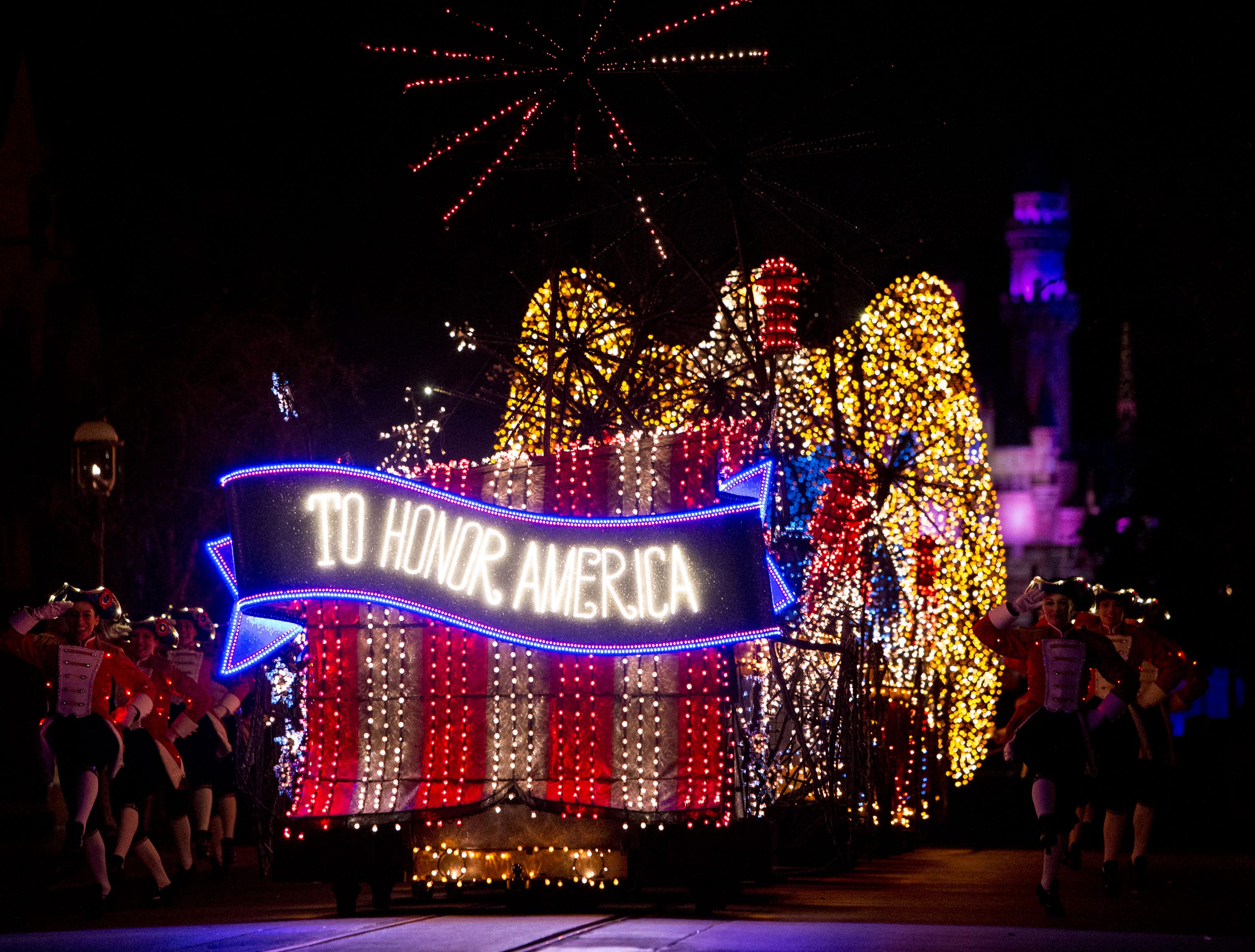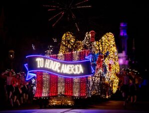 Some of the parade’s most impressive scenes are the 18½-foot-tall Clock Tower looming over Cinderella’s Ball, attended by elegant ballroom dancers in costumes covered with lights; and the 118-foot-long finale unit, a red-white-and-blue tribute to America. Elliot, the smoke-breathing, tail-wagging “Pete’s Dragon,” weighs more than 5,600 pounds and is 16 feet tall, more than 10 feet wide and 38 feet long. Guests will need to keep an eye out for Elliot, who disappears from time to time along the route.
