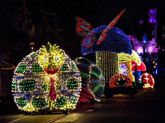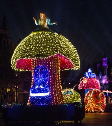Accompanied by treasured Disney tunes interwoven with the distinctive “Baroque Hoedown” synthesizer soundtrack, the Main Street Electrical Parade brings a variety of beloved Disney stories to life in parade floats covered in approximately half a million twinkling lights. Mickey Mouse, Minnie Mouse and Goofy lead the way and Cinderella, Peter Pan, Snow White, Pinocchio and Alice in Wonderland are among the characters whose stories unfold along the parade route. Tinker Bell now appears with other fairies on the Peter Pan float.