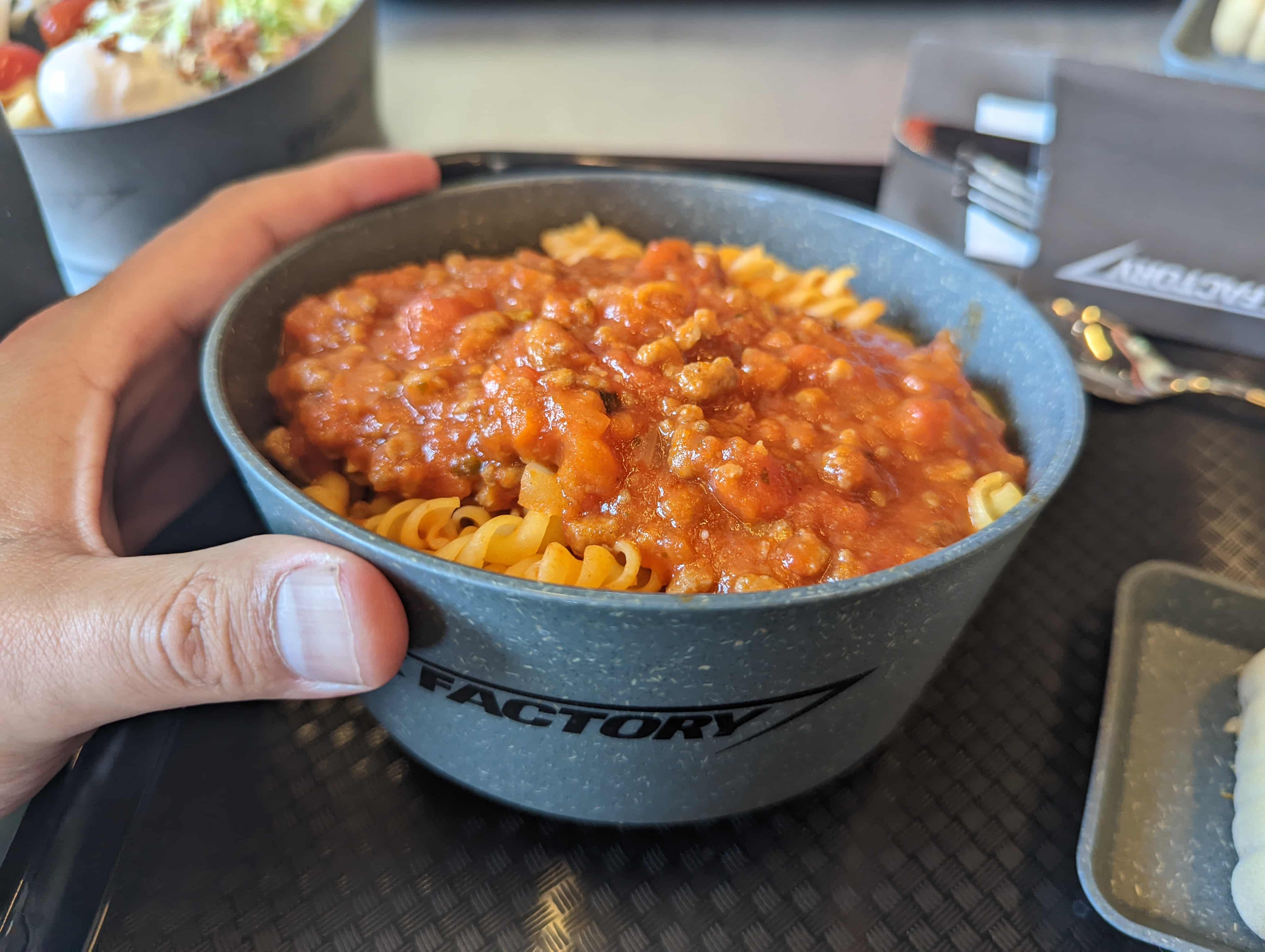 De pasta die we probeerden was de standaard bolognese die een beetje glansloos was als het op de smaak aankwam. Ik had er beslist meer smaak, of misschien zelfs een beetje pittige smaak aan verwacht. Er zijn zakjes olie, chili, en andere kruiderijen, maar een beetje meer smaak zou fijn zijn. De portie was echter groot, en ik had moeite om het op te eten.