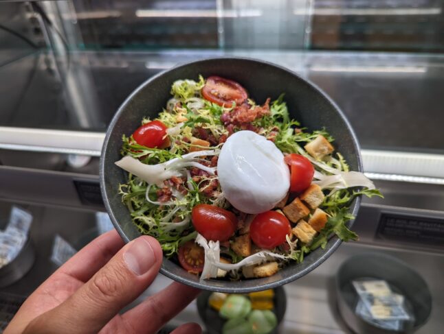 De derde optie is een salade. We probeerden twee verschillende salades en hoewel ze mooi gevuld zijn, ontbreekt ook hier de smaak. Je kunt wat dressing pakken, en ook hier is chili verkrijgbaar, om het wat pittiger te maken, maar het zou lekker zijn om wat meer smaak te hebben om mee te beginnen. De verschillende salades zijn lekker, en zelfs voor een niet-salade-eter als ik was het goed.