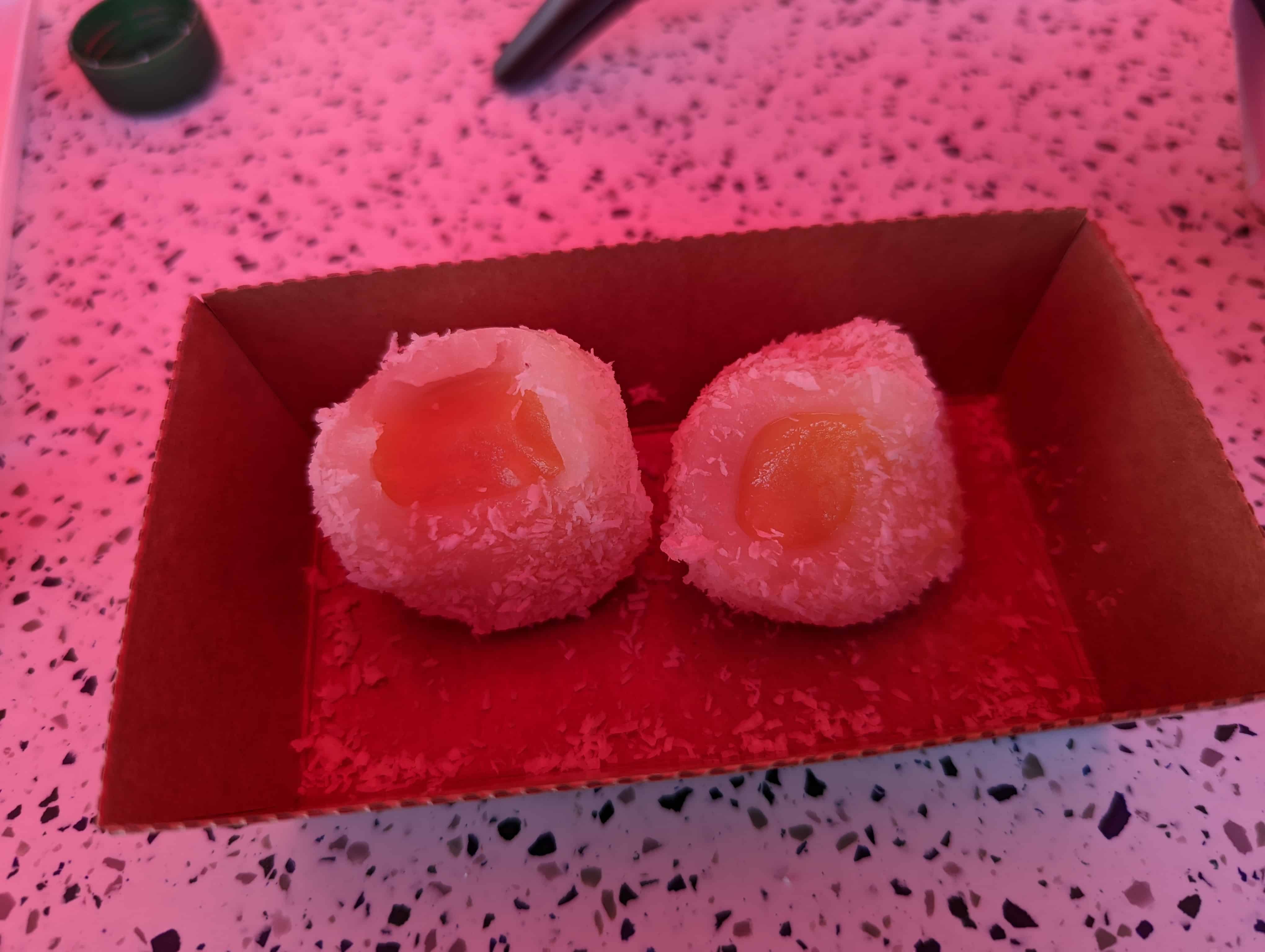 De kokosballetjes werden helaas opgewarmd met een magnetron. We zijn gewend ze gekoeld te eten, dus het kwam als een verrassing dat ze opgewarmd waren. Terwijl we met enkele andere rekruten spraken, kregen we te horen dat dit gerecht zo wordt opgediend in Frankrijk, en zijn vele Chinese restaurants. Dat gezegd hebbende, zouden we het toch graag een keer als gekoeld gerecht proberen. O… en eindelijk hebben we eetstokjes in het resort!