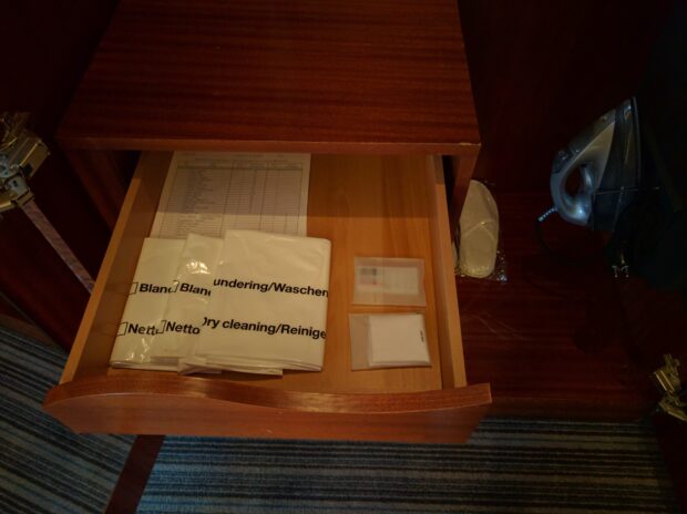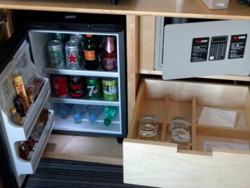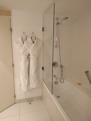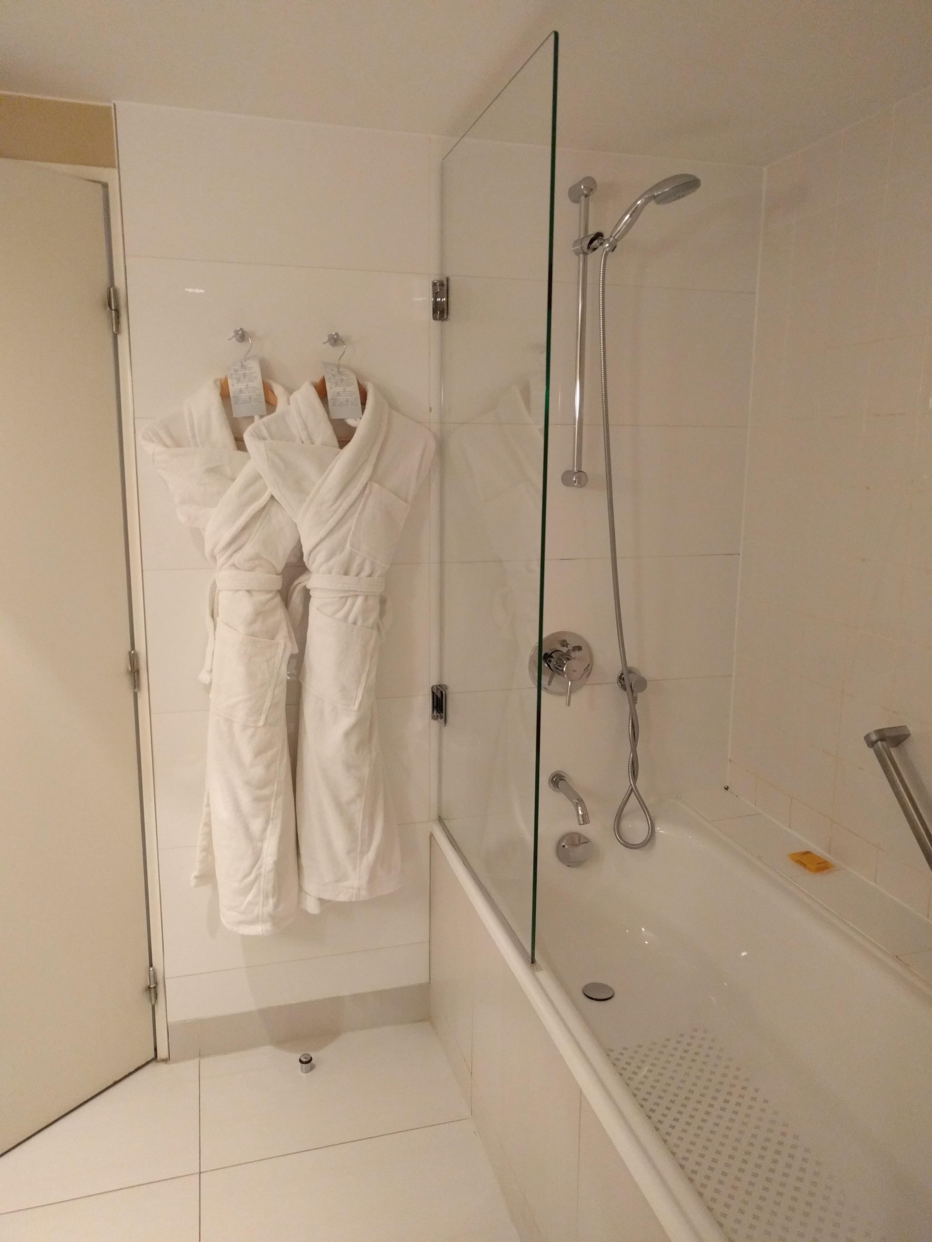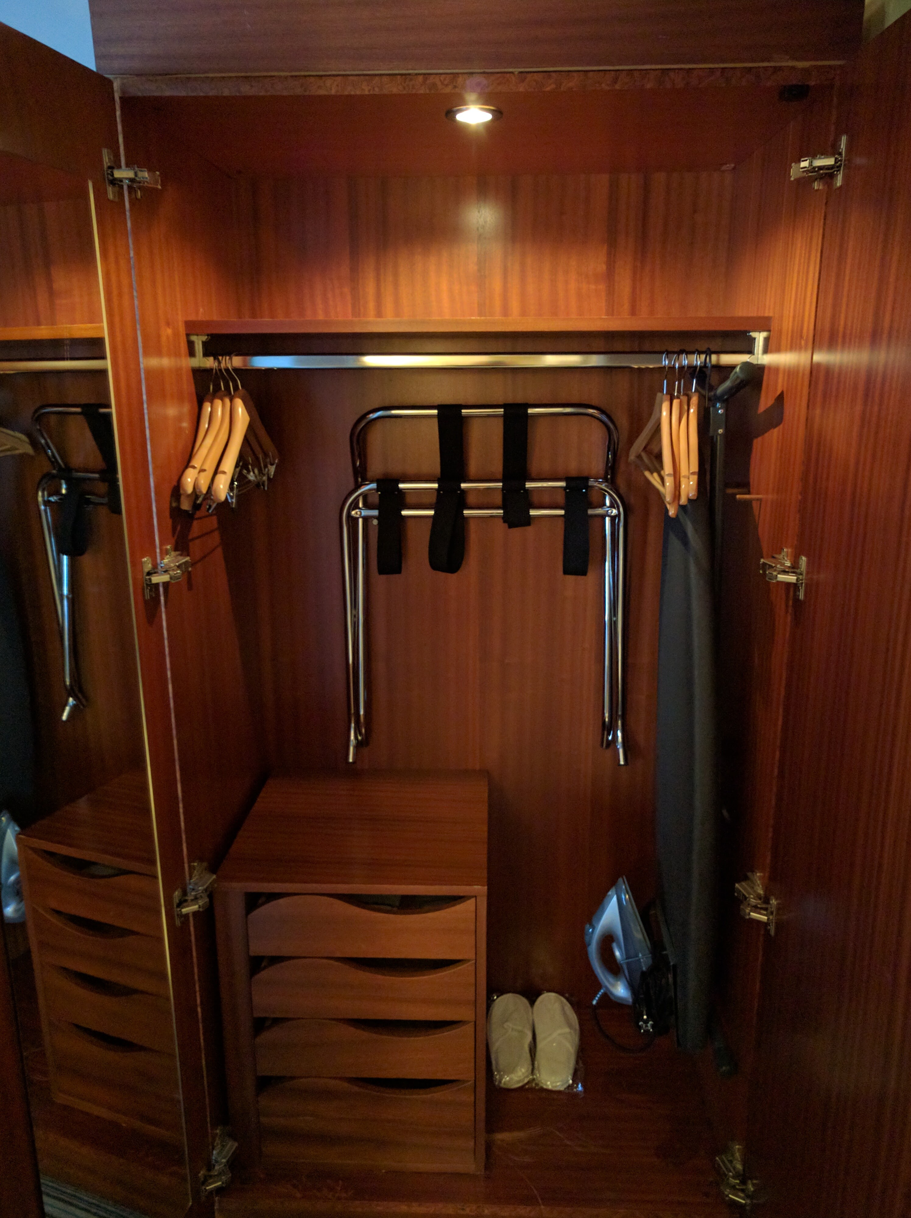 De kamer was van alle gemakken voorzien, zoals een minibar, een kluisje, glazen en kopjes voor het koffie- en theegedeelte. De badkamer bevatte shampoo, conditioner, body wash en lotion, samen met een paar schoonheidsartikelen. In de grote leefruimte staat een grote kast voor uw bagage en kleding. Ik vind het wel vreemd dat het geen ingebouwd toestel is, maar toch, het was goed opgezet voor de reiziger. De kast bevatte laden om kleren in op te bergen en veel hangruimte, samen met een strijkplank. Een leuke toevoeging aan de kamer waren de badjassen en slippers.