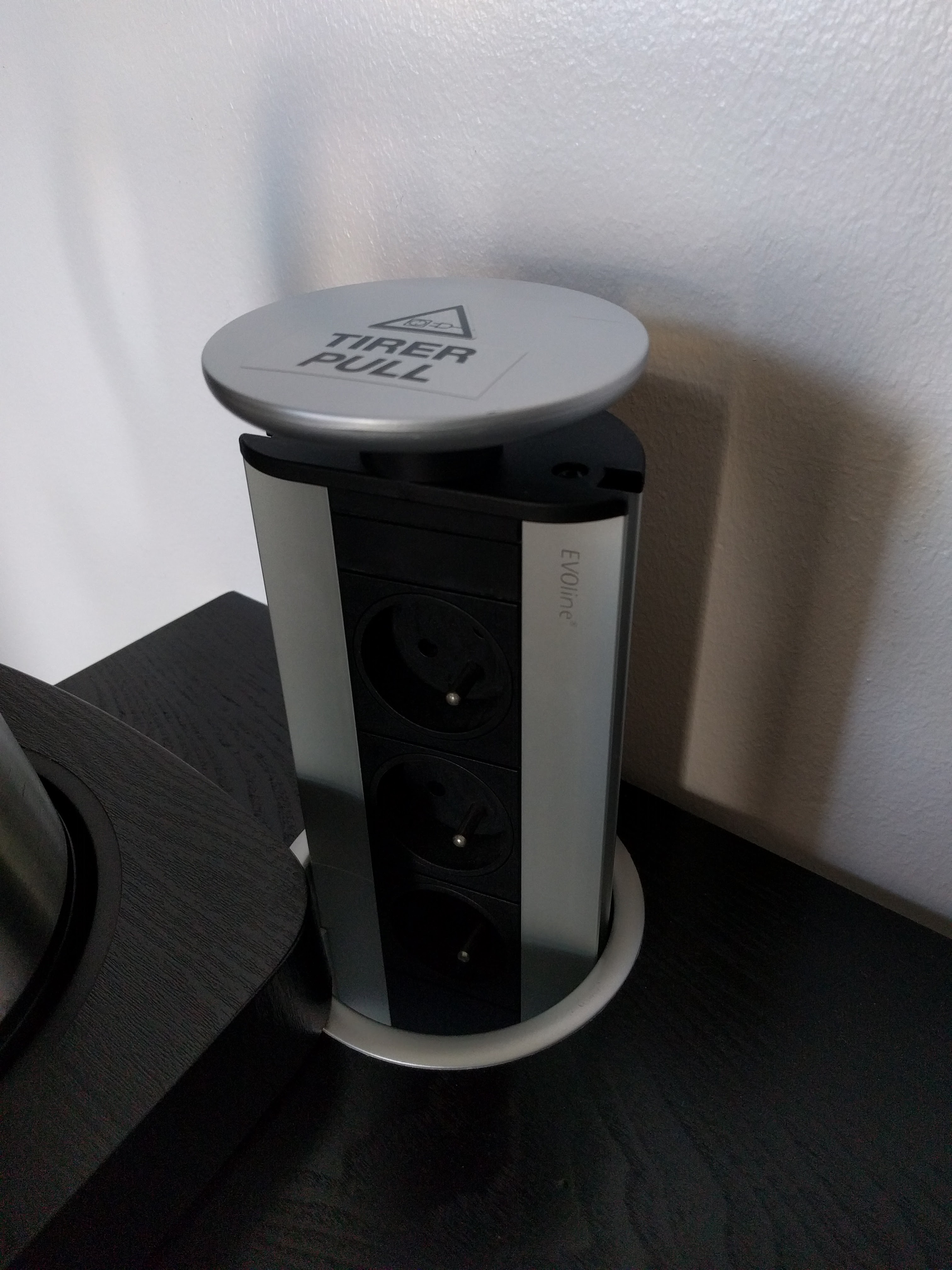 Het bureau was mooi opgesteld met veel ruimte om te werken of om al je spullen neer te leggen. Er was een oplaadpoort met drie stopcontacten die je in het bureau kunt wegstoppen als je ze niet nodig hebt.