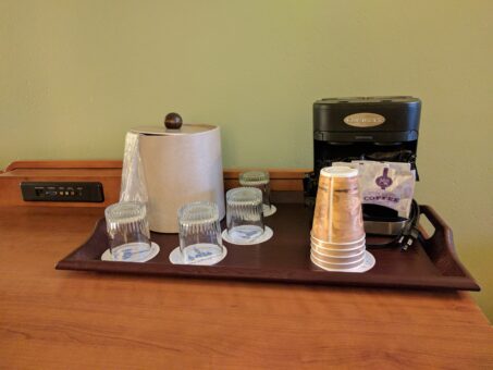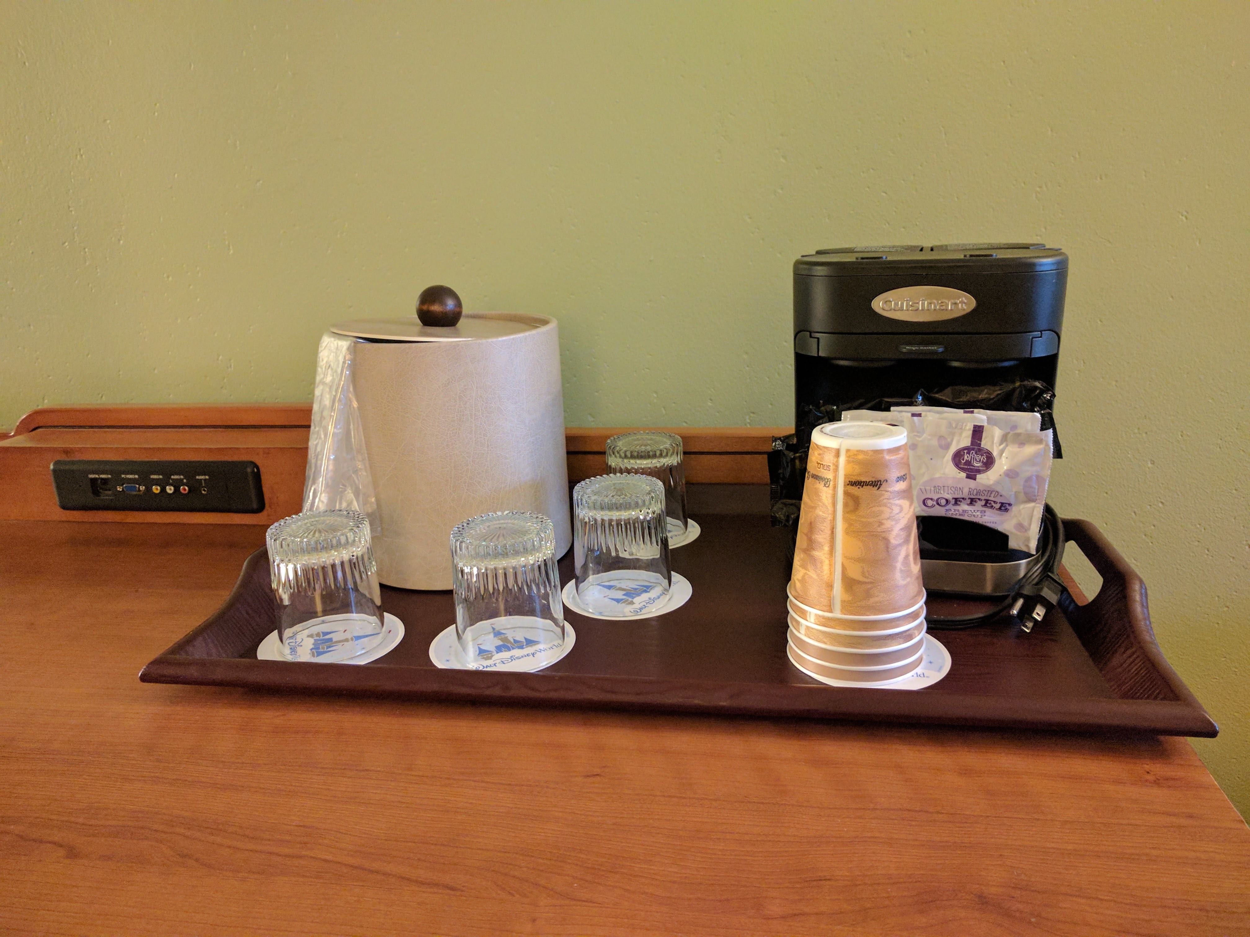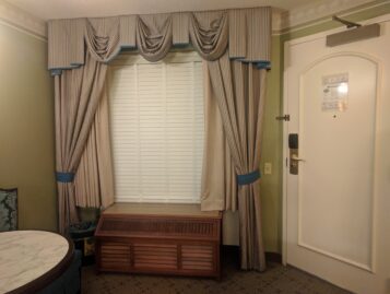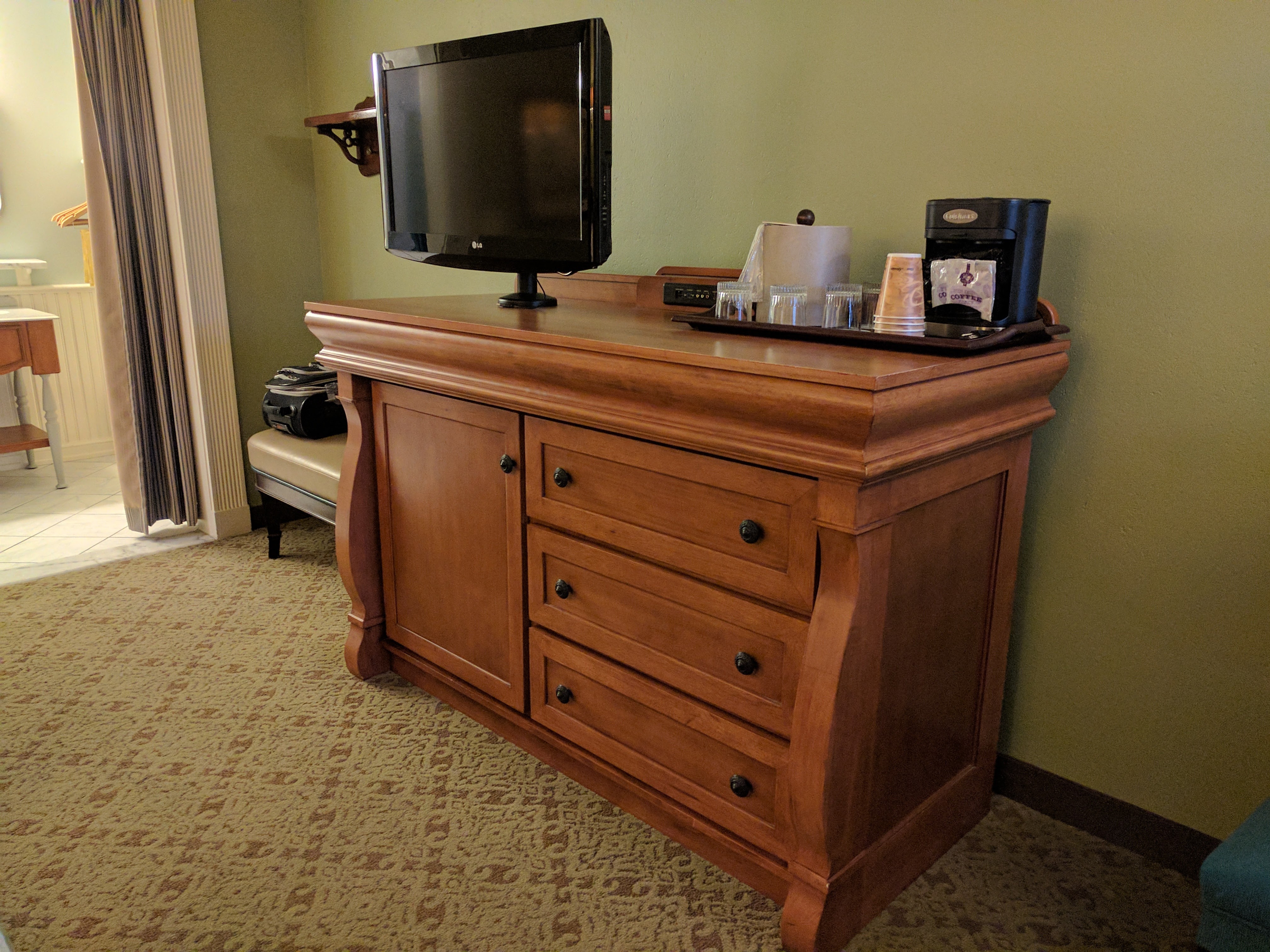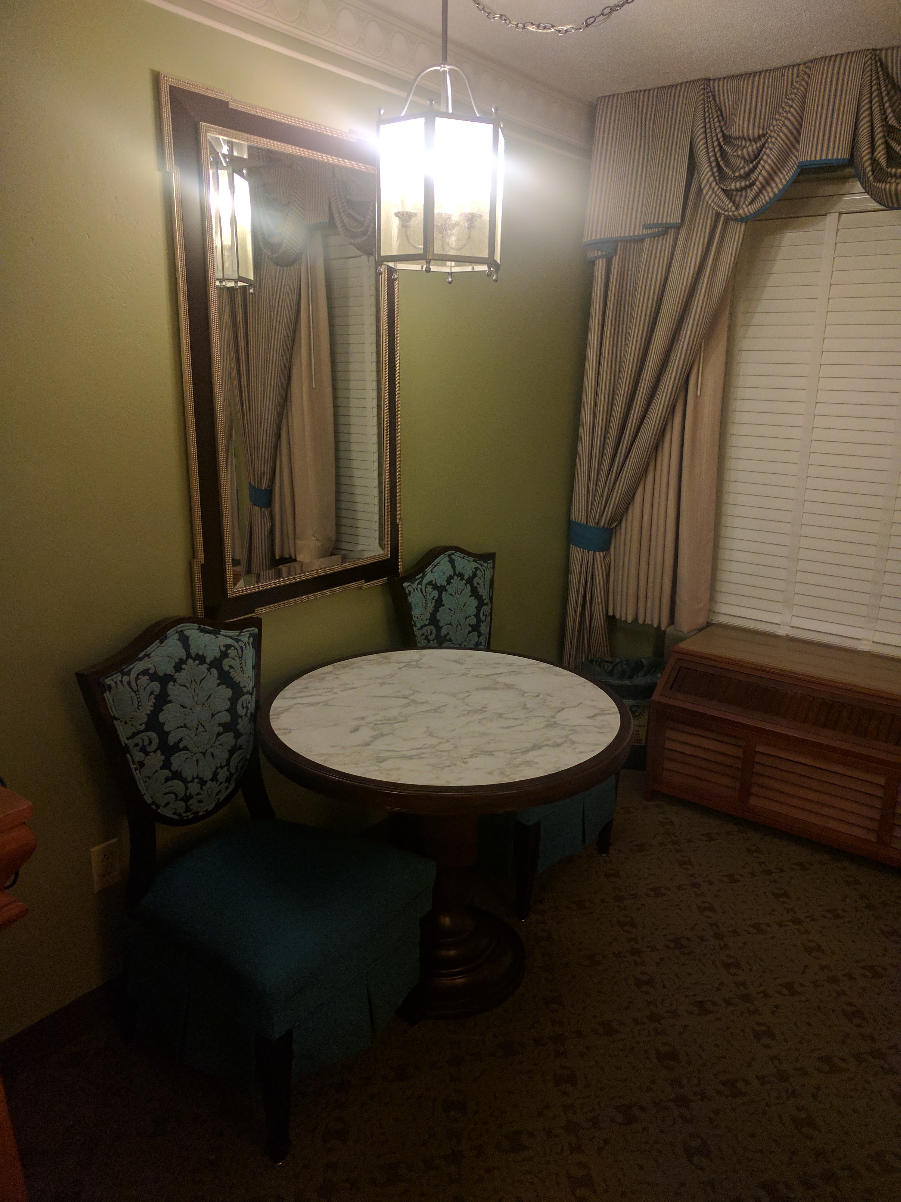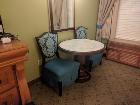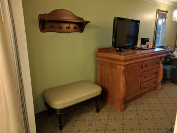 De kamer heeft een kleine ronde tafel en twee stoelen bij de ingang naast de airco-eenheid die mooi is versierd met een houten paneelbekleding om het minder opvallend te maken. Naast de tafel heb je het dressoir met minikoelkast, TV en koffiezetapparaat. Daarnaast is de bagagestoel. Ik vond dit erg handig om een koffer in te zetten om uit te pakken en later de spullen neer te zetten die ik nodig had voor een dagje uit in het park. Boven de zitting bevindt zich een kapstok met een richel om uw jas aan op te hangen of om belangrijke spullen op te leggen. Nogmaals, een geweldige plek om dingen te laten die je dagelijks nodig hebt.