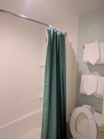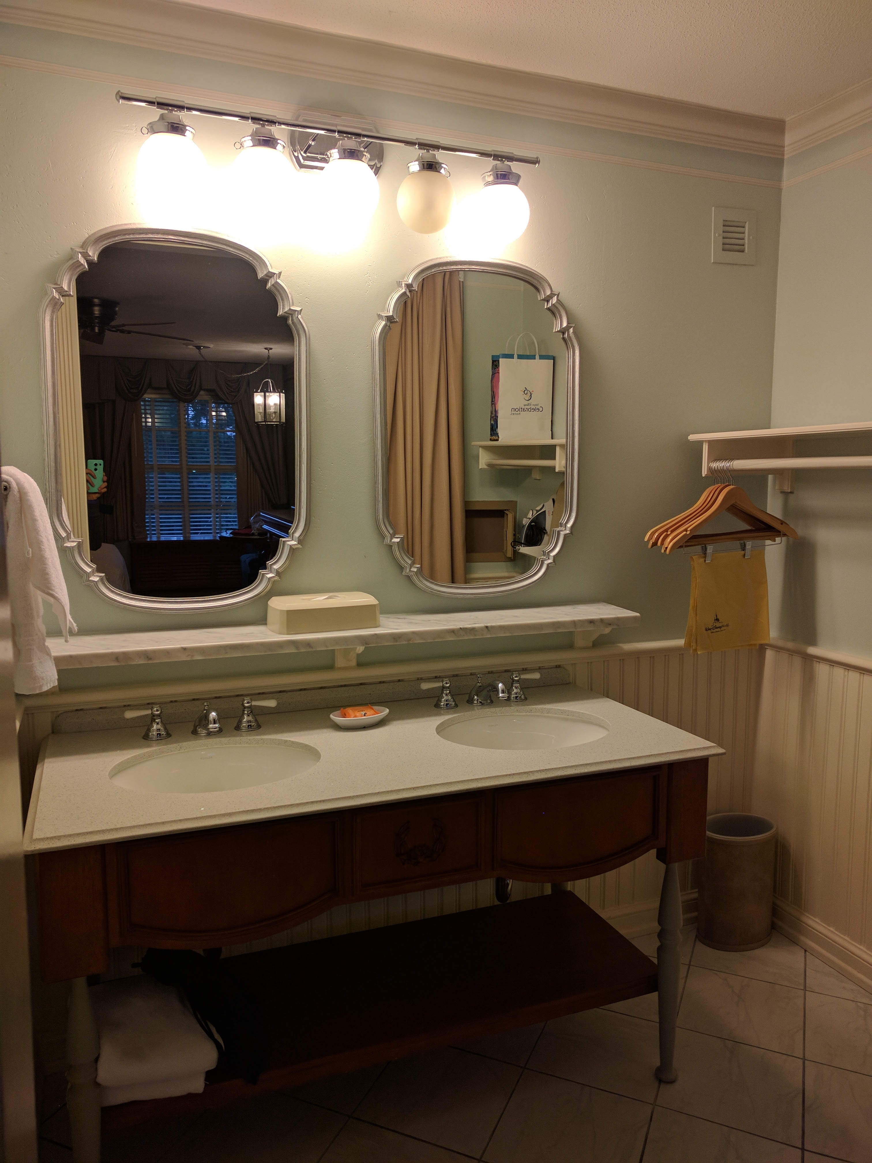 Het volgende is de badkamer. Het enige minpuntje is de ingang naar de badkamer. In Port Orleans hebben ze een privacy gordijn dat geen geluidsisolatie of lichtblokkering biedt als familieleden zich ’s morgens klaarmaken. Toch vind ik de indeling van de badkamer mooi. Er is een dubbele wastafel, wat handig is als u zich ’s morgens klaarmaakt, en veel open opbergruimte onder de wastafel en boven op de marmeren richel.