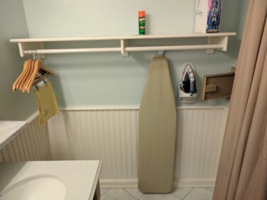Rechts van de gootsteen is een van de mooiere opbergruimtes die ik heb gezien. Het is eigenlijk een open ruimte met een wand-tot-muur kapstok, maar je kunt er gemakkelijk een paar grote koffers kwijt. De kapstok heeft ook een richel die groot genoeg is om er extra spullen op te zetten. Het strijkijzer en de plank zijn hier ook opgeborgen, evenals de piepkleine kluis die nog met de oude sleutelmethode werkt. De douche/bad combinatie en het toilet zijn standaard Disney installaties, maar het witte tegelwerk past goed bij het landhuis thema en de groene muur.