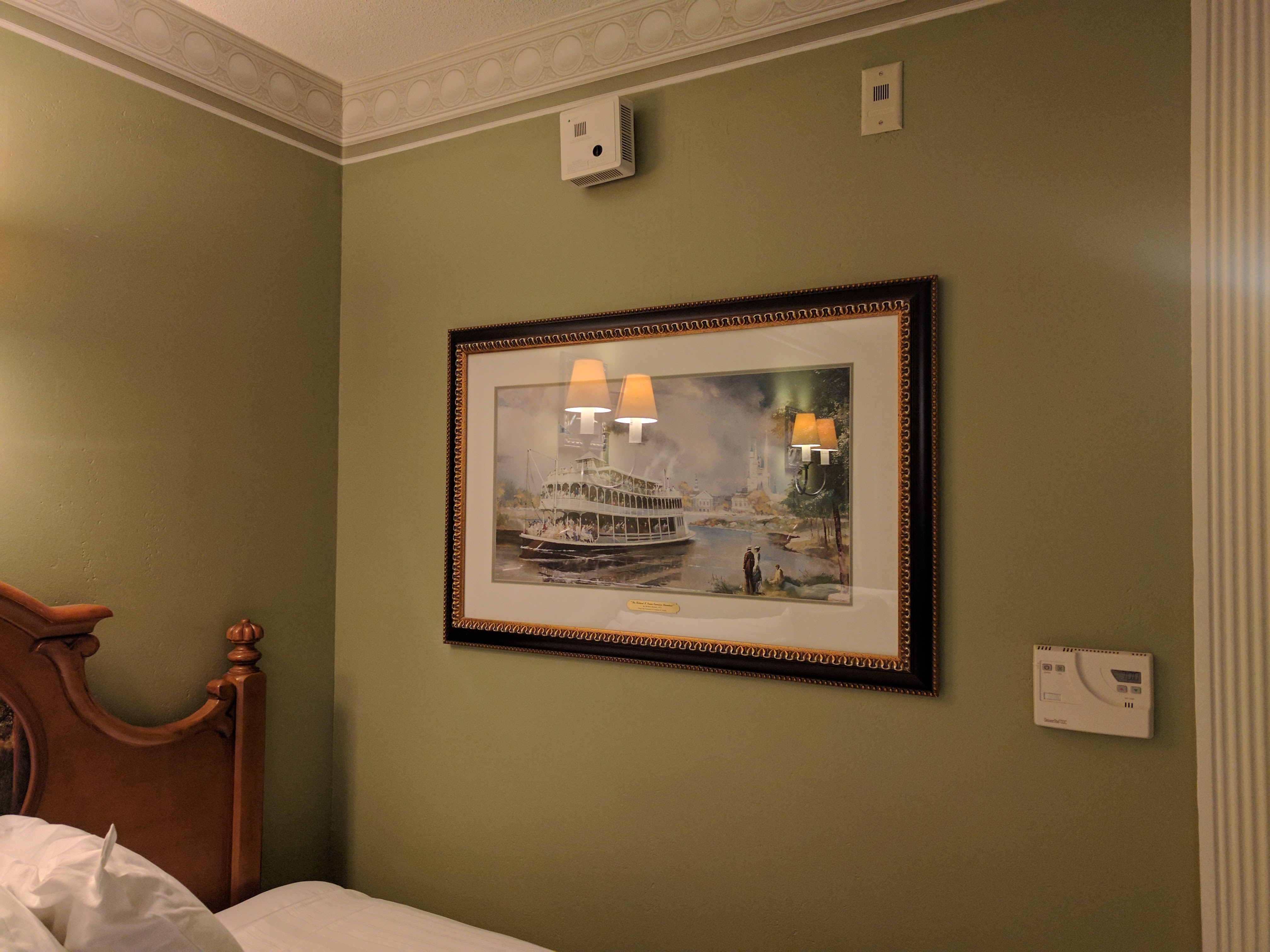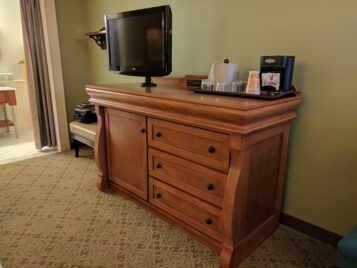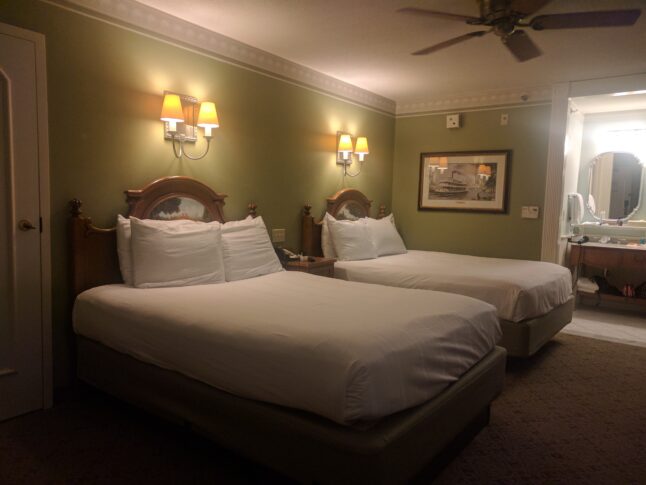 Onze kamer was in Acadian House op de derde verdieping. De kamer weerspiegelt de buitenkant van het gebouw met de accenten van zuidelijke charme en finesse. De kamer is voorzien van houten accenten en groene muren waardoor het vrij rustig en eenvoudig is. Op de hoofdeinden zijn kunstwerken aangebracht en een kunstwerk waarop zuidelijke landhuizen en de klassieke rivierboten zijn afgebeeld. De basisvoorzieningen die men in de kamer verwacht zijn er echter wel en zijn praktisch op hun plaats en opstelling. Er is hier geen Disney-karakter, dus sommige gasten kunnen het een beetje gewoon vinden.