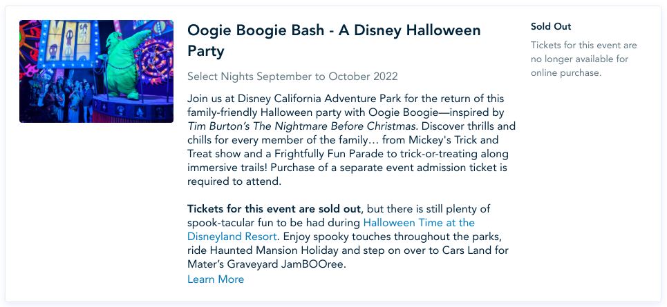 It is a record for Oogie Boogie Bash to sell out this quickly. In 2019 the event only sold out in mid-September, and last year it took until Mid-August.