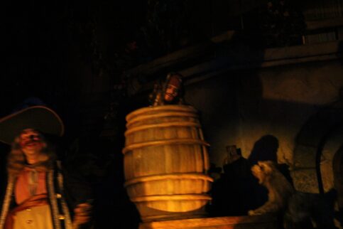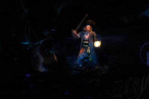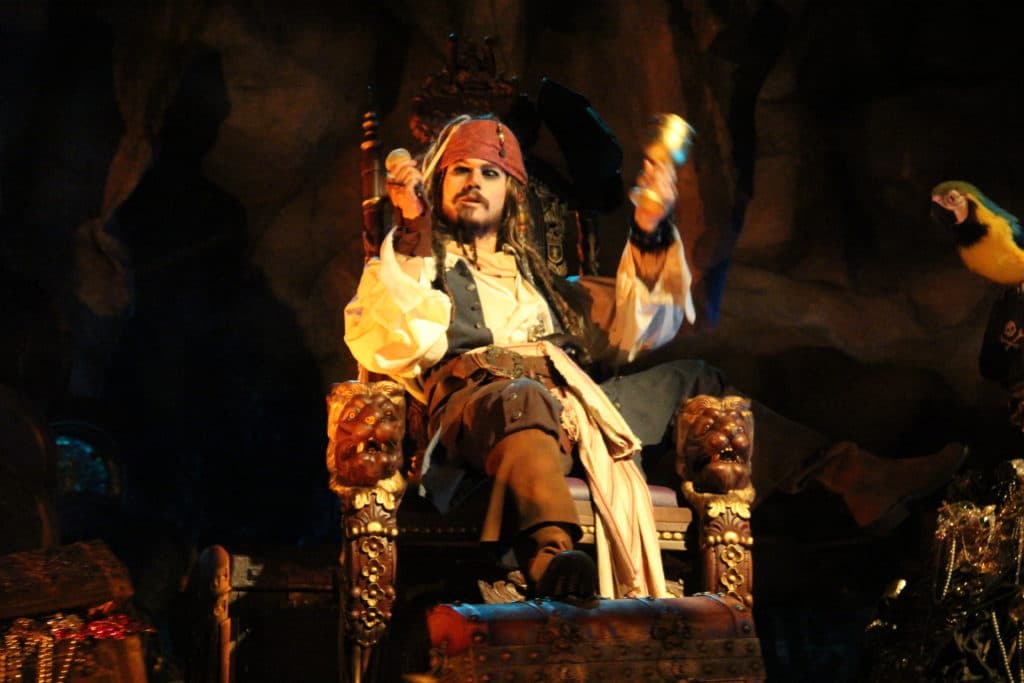 While we make our way through the cave, we are reaching the end of Pirates of the Caribbean. But we still have to see the finale scene; Captain Jack. When we reach the last room, we see Captain Jack sitting on a pile of coins. But Jack is not a skeleton, we can clearly see Jack while he enjoys his treasures. Jack sings; Yo Ho, A Pirate’s Life For Me. And that unfortunately is the end of this renewed Pirates ride.