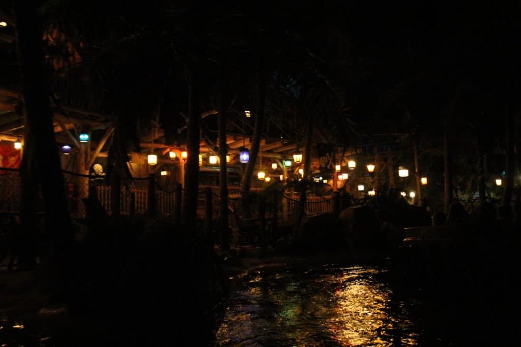 While the boat left the station, we made the first turn towards Captain Jack’s. With the name change from Blue Lagoon, Captain Jack’s is flying some pirates flags now, but besides that we only saw some minor cosmetic changes, nothing major you would notice from the boat. At the end of this first scene, we traveled through a broken-up ship where you see a crab and octopus guard a treasure. These animatronics didn’t move all the time, but now they are both working which is nice. The first scene ends with a projected moon which looked sharp and clean. From what I understood, this was supposed to be there in the original ride but I never saw it myself. Now it looked nice and clear.