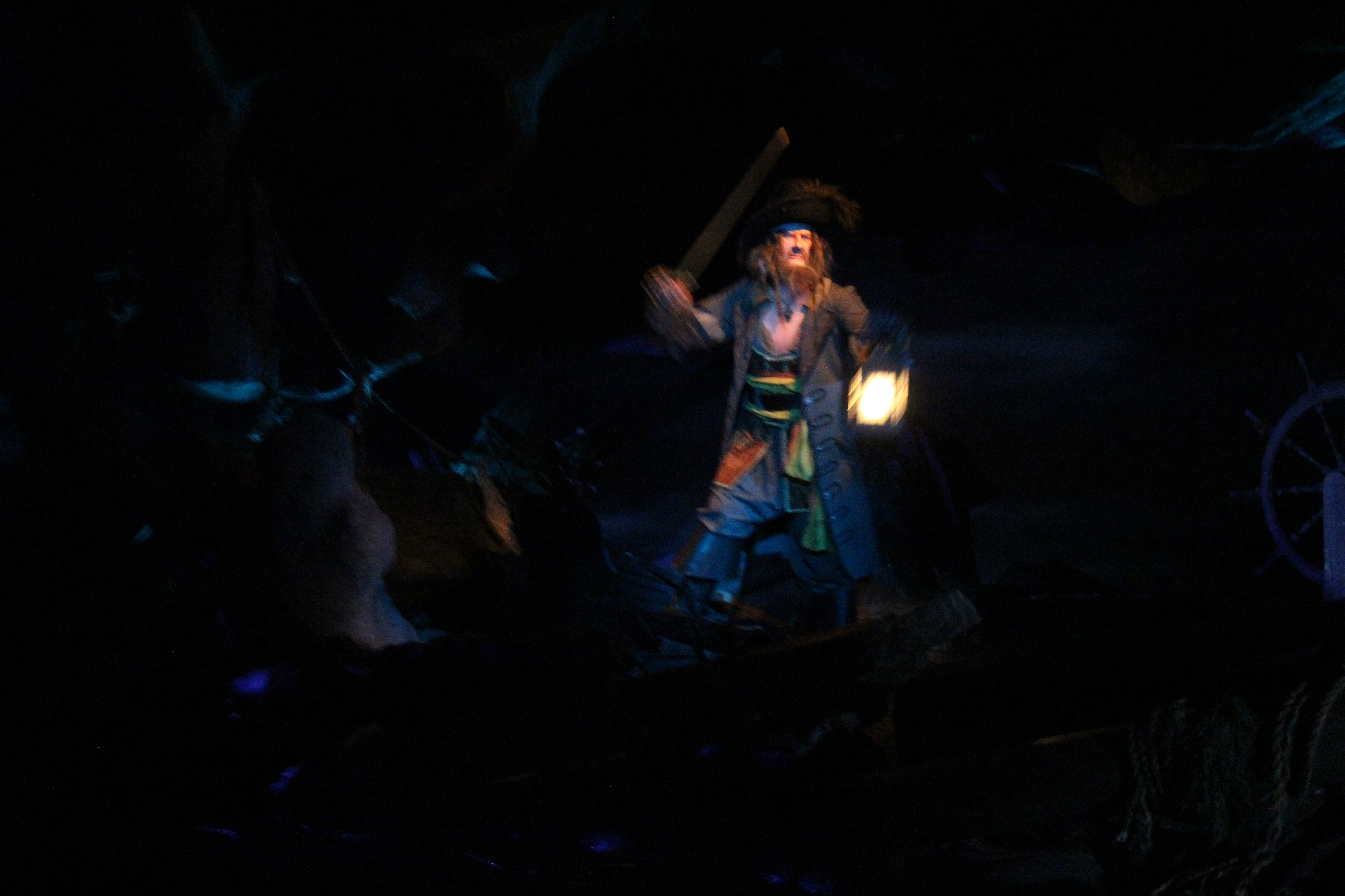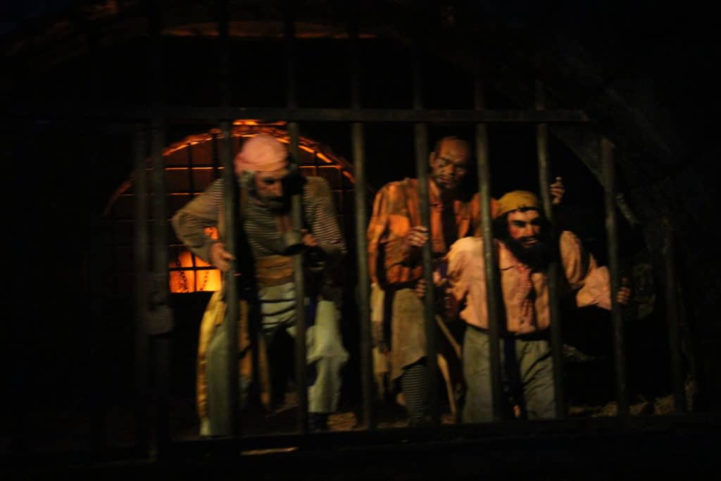 While you are still trying to get your senses back after the drop, you are slowing drifting towards a new major addition to the ride; Captain Barbossa. Where we would normally only see a skeleton steer a ship in bad weather, we now see Captain Barbossa. But as we got closer, lightning strikes and Barbossa changes into a skeleton, while he directs us to the last scene with his sword. I must say that this is an amazing effect, similar to what they do a few times at Shanghai Disneyland. The effect for sure fits this version of Pirates quite well.