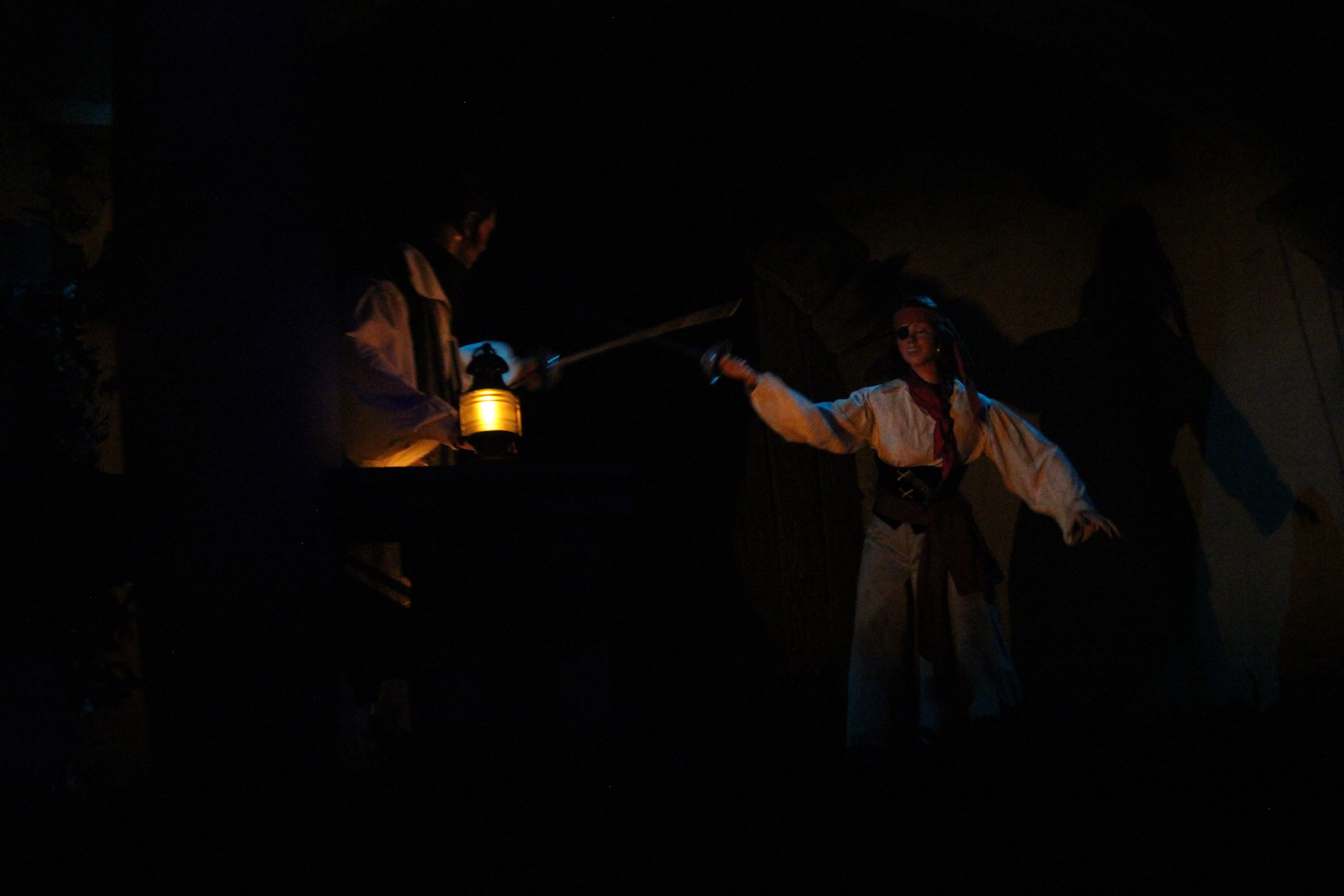 When we pass underneath the bridge, we can also see the first appearance of Captain Jack. He is sinking into the barrel while the pirate who is leaning against it, is talking to his dog about finding Jack. While we move forward, we see a lady and a pirate have a sword fight. This has a nice touch to it, and the sound matches the actual scene. Nicely done Imagineers!