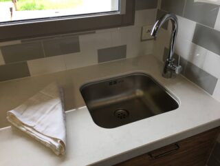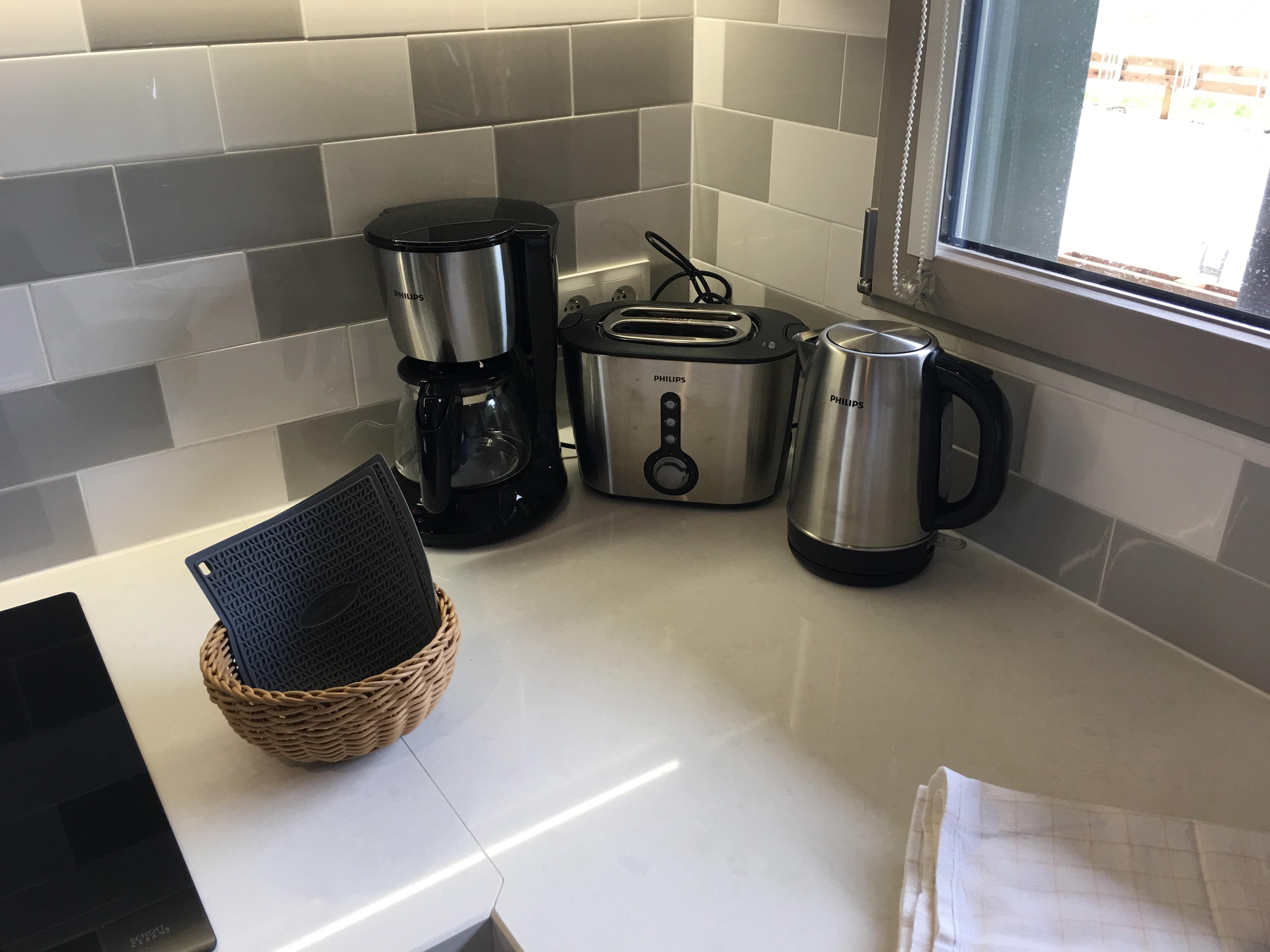 The kitchen nook is perfect for two people and houses plenty of cooking tools and tableware. The refrigerator is a good size and holds a small freezer for ice cube storage. A toaster, coffee maker and water cooker also sit next to the electric stove. As well as a dishwasher which is found underneath the stove.
