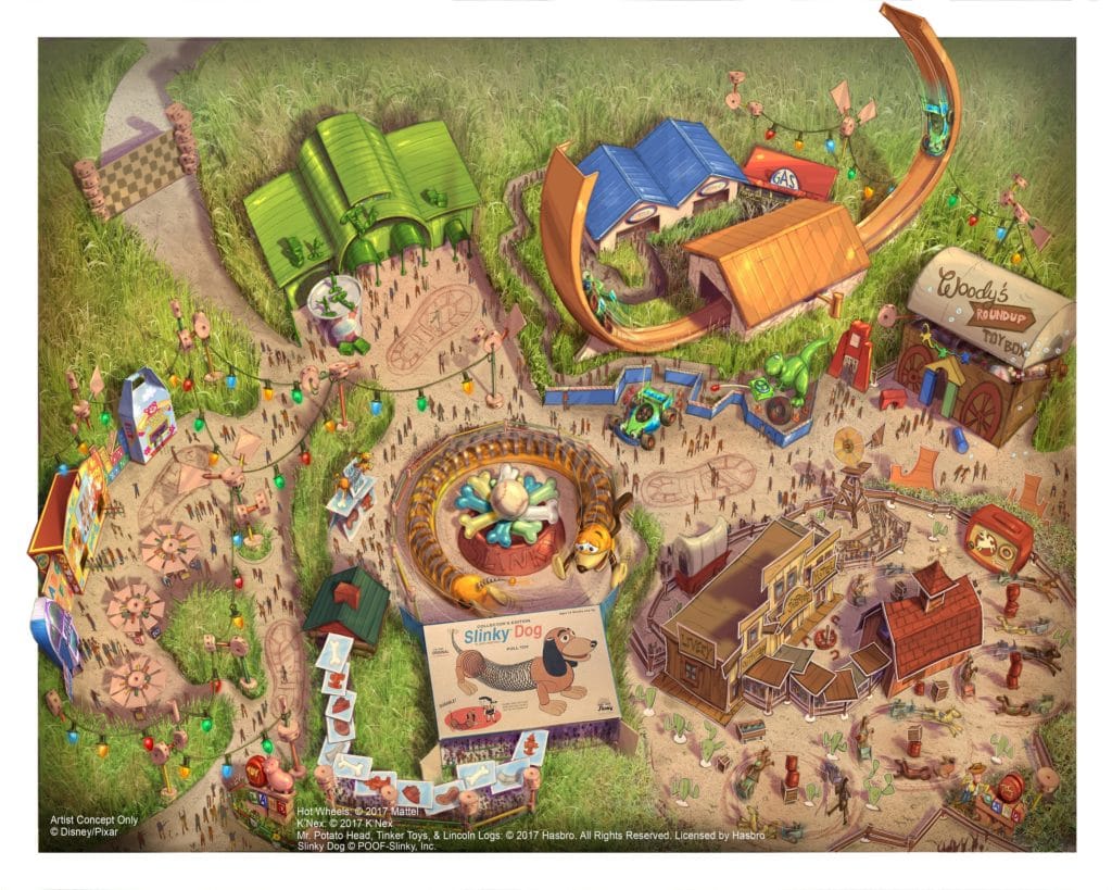 The brand new Disney • Pixar Toy Story Land will feature three new attractions, Slinky Dog Spin, Rex’s Racer and Woody’s Round-Up, and a uniquely themed character greeting area. Guests can also extend their experience with fun, immersive shopping and dining opportunities in Al’s Toy Barn and Toy Box Café.
